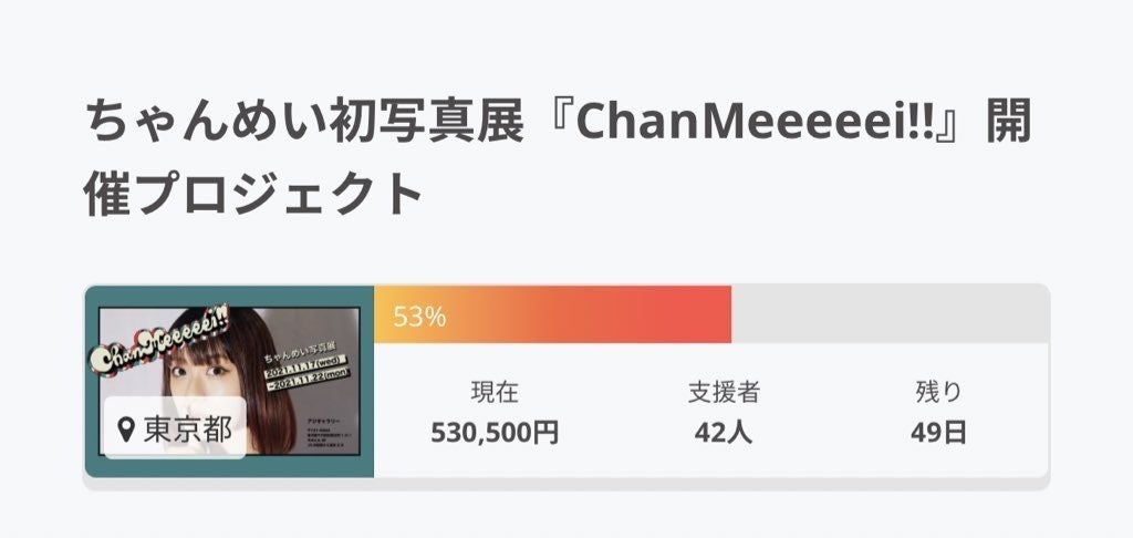 こんばんは、ちゃんめいです!■ちゃんめい写真展『Chanmeeeeei!!』クラファンスタート!!1日でなんと達成率53%!!感謝感謝です…ただ、クラファンは勢いが弱まっていくのは想定内なのでそれにメンタルやられないよーに、皆様の初動のこのご支援を糧にほんとに達成までやり切りたいです今日から達成率の報告と、制作の進捗、ギャラリーなどについてこちらで説明していきますね■SNSの皆様の拡散とっても大事↓↓こちらコピペや、あたしのツイートに引リツでコメントなどつけてもらえると感謝噛み締めて私もリツイートさせていただきますちゃんめい初写真展『ChanMeeeeei!!』開催プロジェクト - クラウドファンディングCAMPFIRE https://camp-fire.jp/projects/view/466542 #クラウドファンディングCAMPFIRE @chamento_moriより■質問等々ちゃめクラファンページや、各SNSのDMなどでお気軽にどうぞ!(共有させていただく場合もあります)では、最後までこのちゃんめの戦いお楽しみください♡