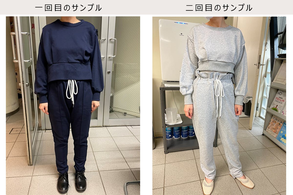 サンプルの作成を繰り返し行い、工場さんと綿密なやりとりをしながら、小柄さんが一番美しく見えるベストなサイズ感に仕上げるべく、修正を繰り返しました。