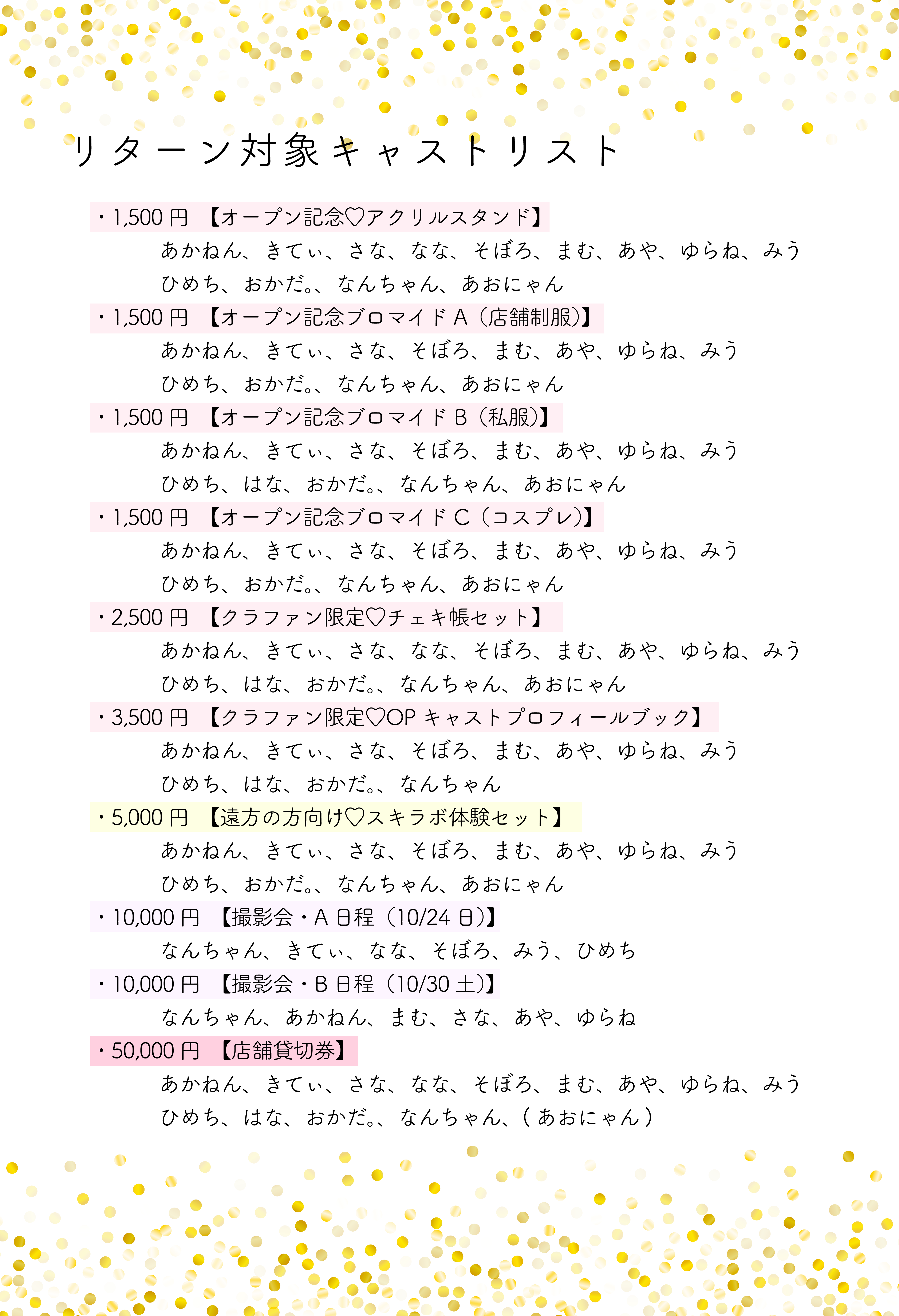 希望キャストをお選び頂くものに関しましては、下記リターン対象キャストリストをご確認ください!