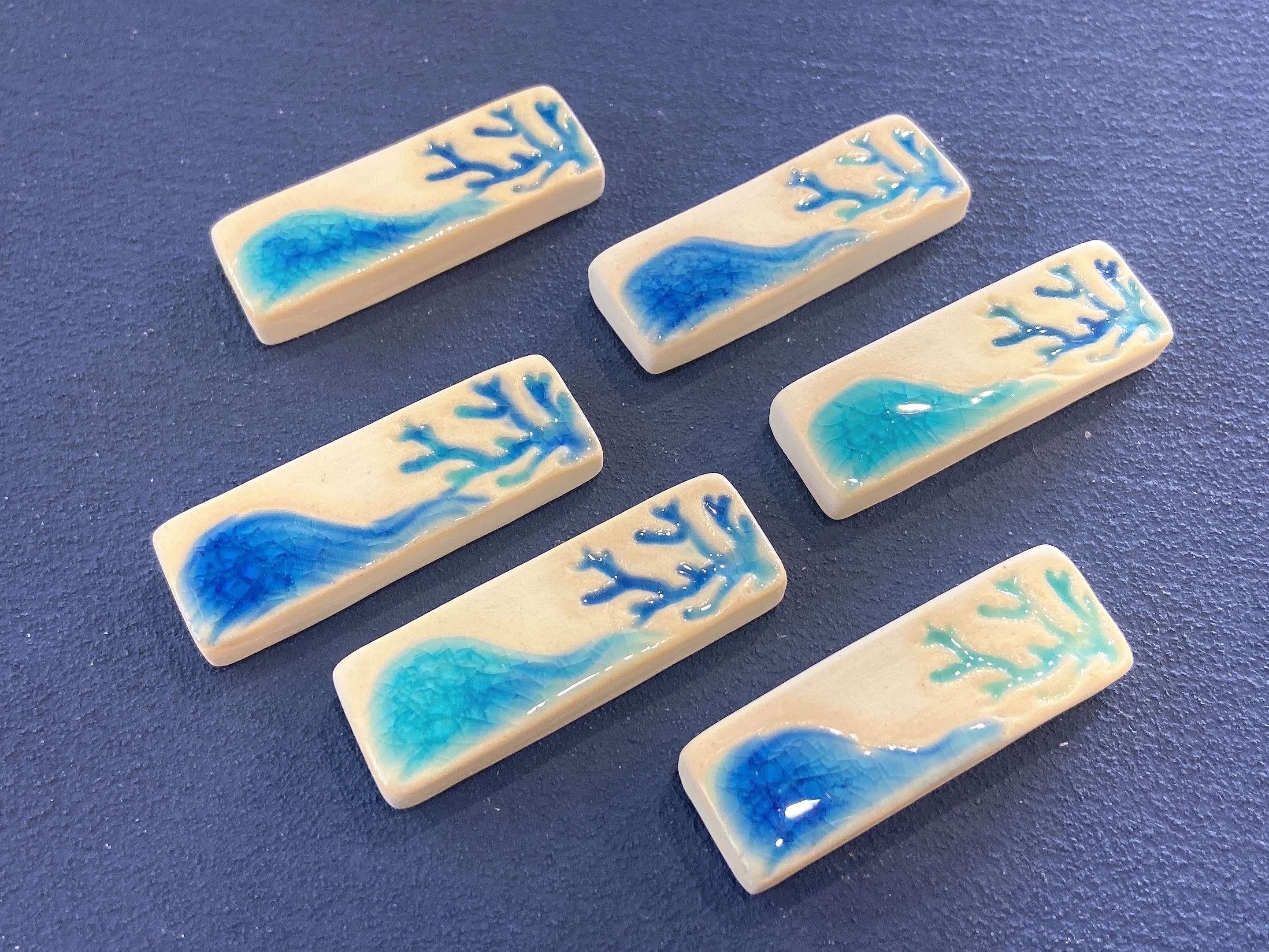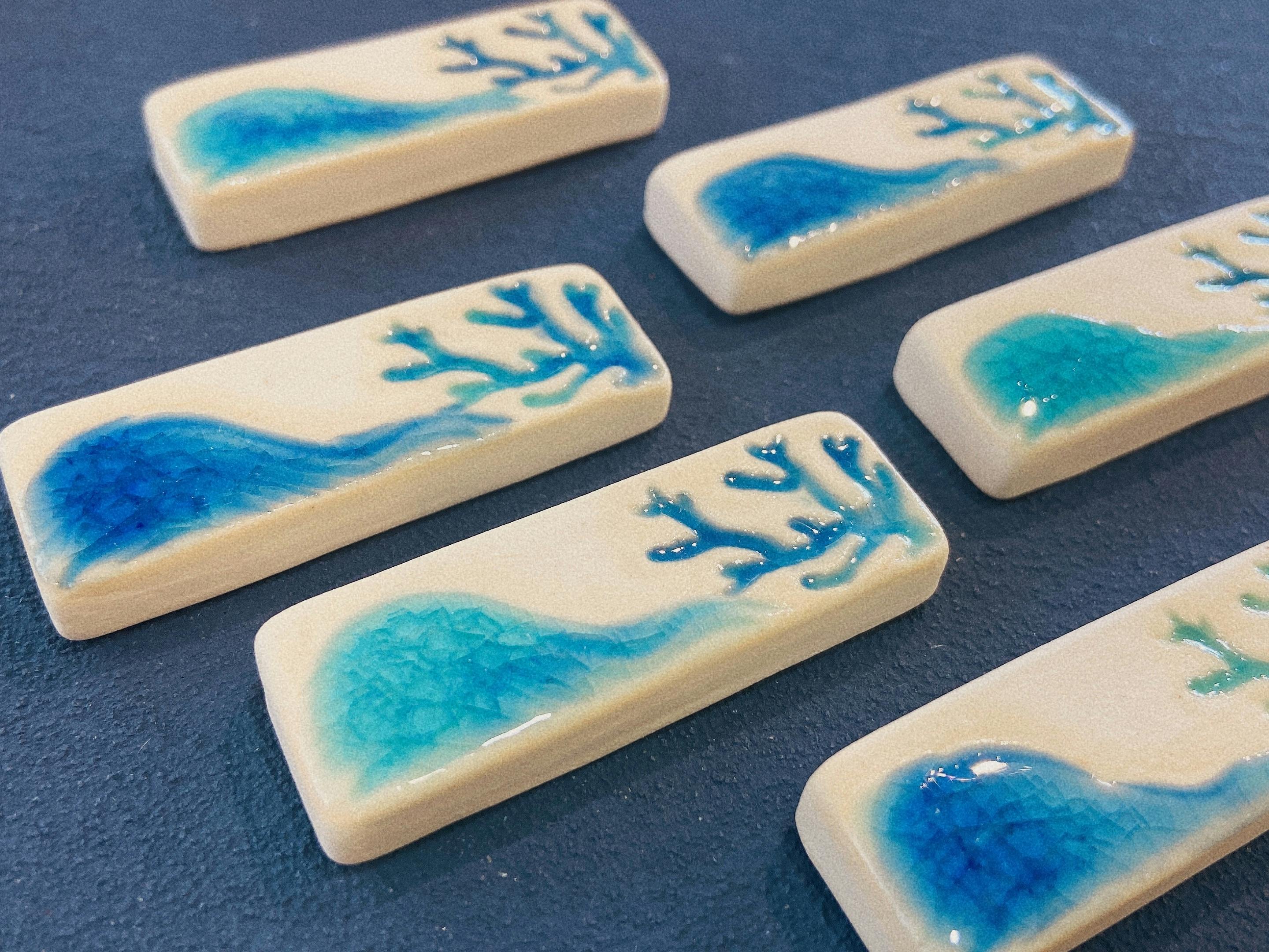 こちらのお箸置きは、完全石垣マルシェのオリジナルデザインです。イメージは石垣島の海と珊瑚。私がささっと描いたデザイン画を元に、想像以上に素敵に焼き上げてくださいました。