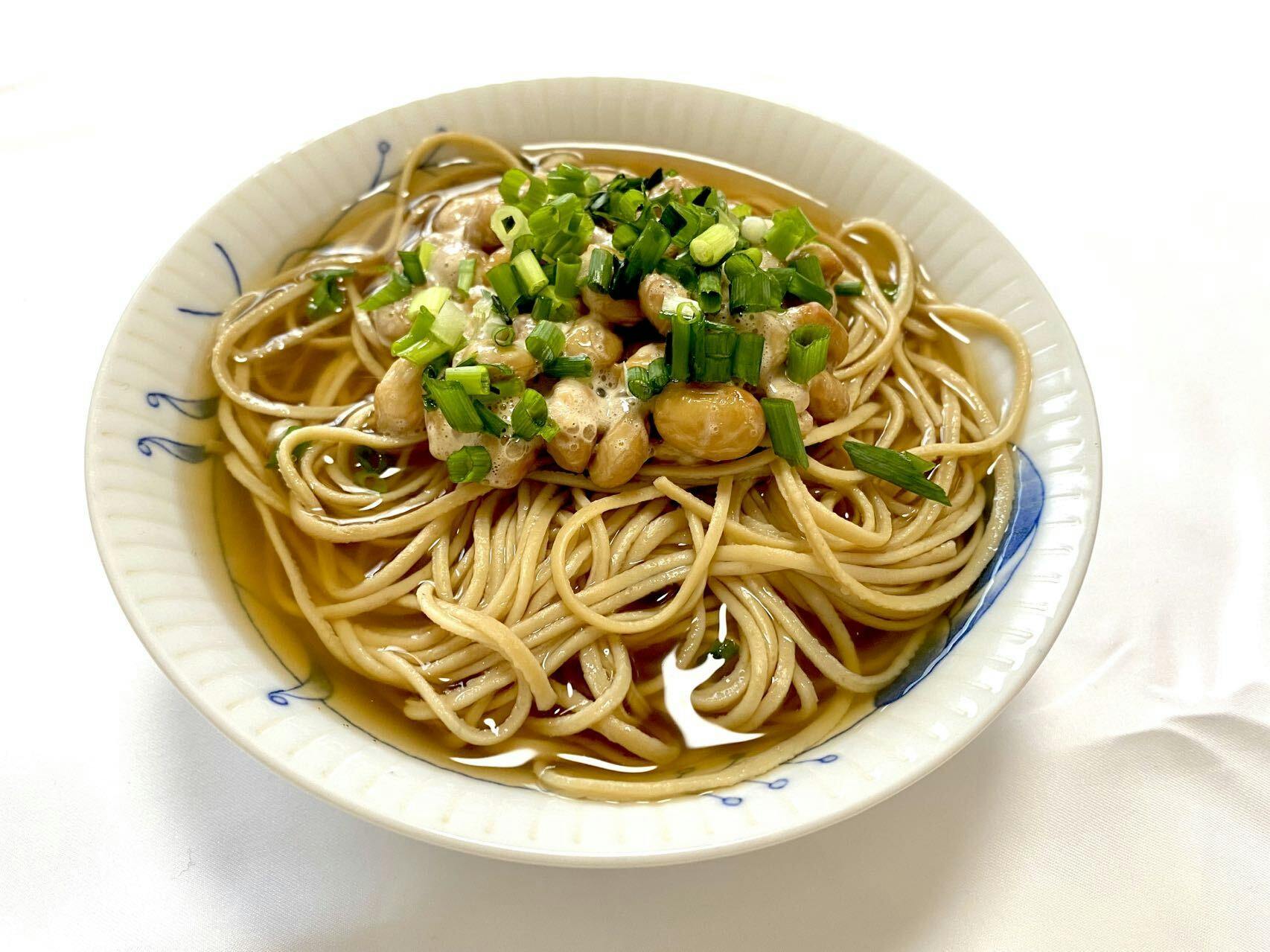 ④沸騰したら②の麺に熱々の汁をかけて納豆を乗せ、ネギを散らせて完成。