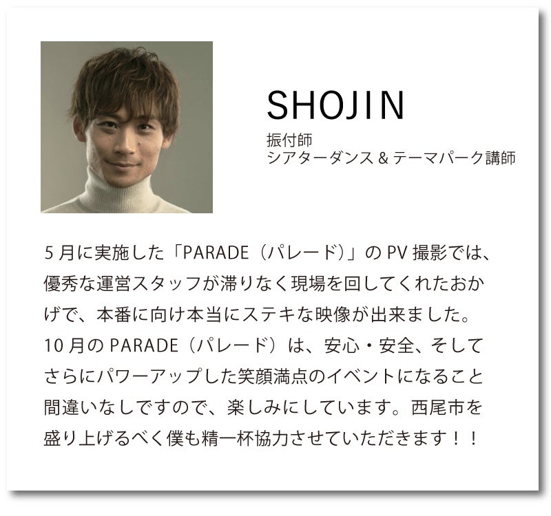 2021/10/26 12:53以前の活動報告でも案内させて頂いたPARADEのシーンも登場すると思われるテレビ放映について、延期が続いてしましたがついに本日放映されるようなので改めて告知させていただきます^^PARADEで全面協力いただいたSHOJIN DANCE LABO主宰の振付師SHOJINさんにスポットをあてたテレビ取材の集大成の収録がなんと10/10のPARADEでした!PARADEの様子もきっと映っている(であろう。であると信じたい。。)密着映像がいよいよ本日東海テレビにて放映されます!▼詳細東海テレビ「ニュースONE」振付家SHOJIN密着特集「コロナのムコウ」18:00時台に放映予定https://www.tokai-tv.com/newsone/なんと10~15分ほどにもおよぶ特集だそうです!コロナ禍においてダンサーたちができること、是非ご覧頂いて応援よろしくお願い致します。 もっと見る