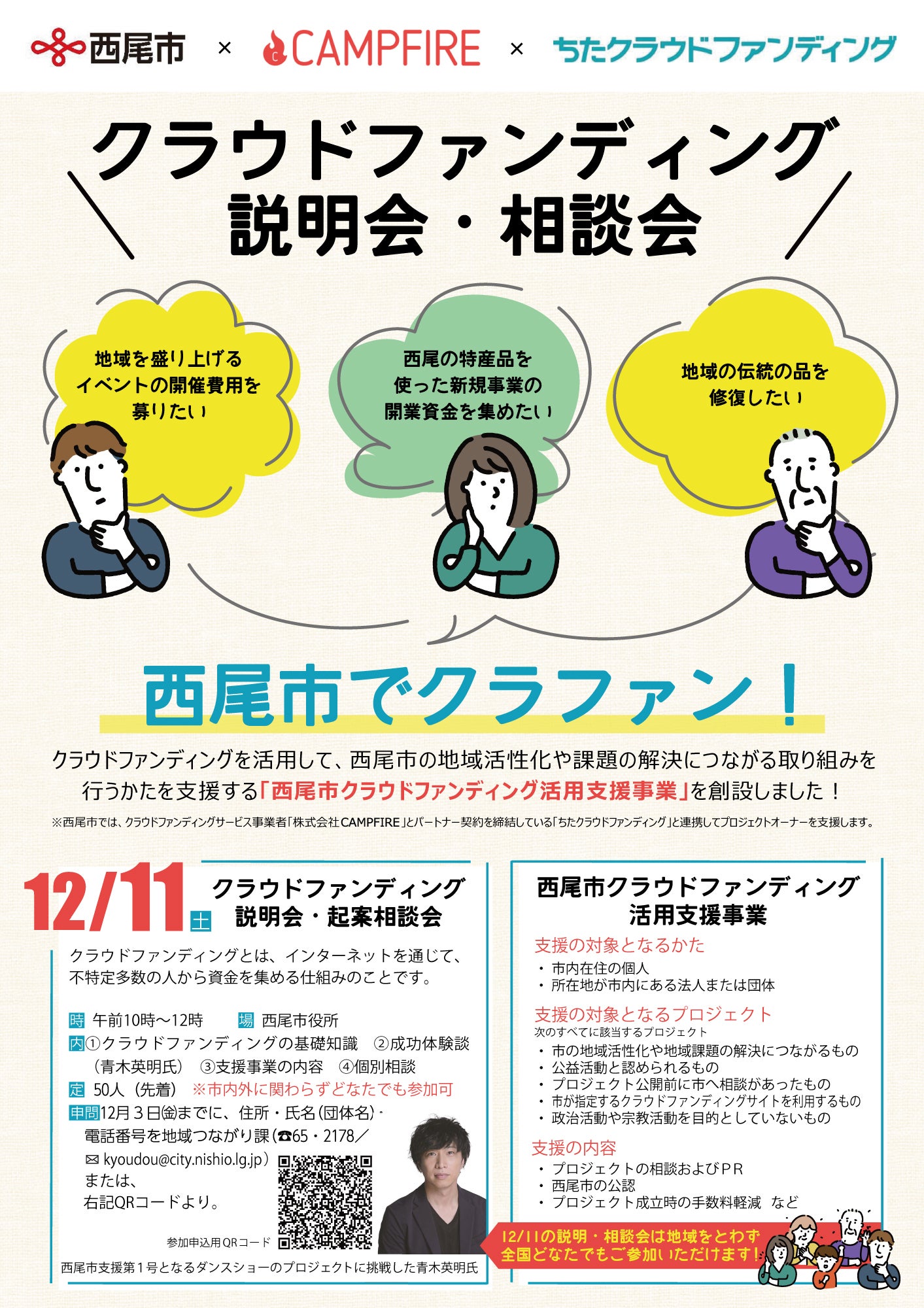 2021/12/08 22:1410月開催のPARADEのための当クラウドファンディングでは多くの皆さまからのご支援をいただき達成することができました。改めて本当にありがとうござました。当クラウドファンディングは愛知県西尾市の『クラウドファンディング活用支援事業』の公認第1号として開催し無事に達成できたことで、この度、西尾市役所で今回のクラウドファンディングの成功体験談をお話する機会をいただきました。クラウドファンディングとは?西尾市クラウドファンディング活用支援事業とは?という説明会に加え、私の経験談をお話する時間を約30分ほどいただきました。せっかくの時間ですので、今回の経験談だけでなく、これまで何度も挑戦してきたクラウドファンディングの経験に、私の本業のひとつでもあるネットショップ運営の知識を取り入れた、聞いて損はない結構仕上がったお話をお届けできる予定でいます^^この説明・報告会は、西尾市外の方も全国誰でも無料でご参加可能です。すでに市外の方からも複数申込みいただいているようです。・クラウドファンディングについて知りたい・行政による支援制度を知って自身の市にも提言したいなど、クラウドファンディングのことをネットからではなく、安心できる場所で無料で直接聞ける希少な機会ですので、ご興味ある方は是非ご参加下さい^^直前のご案内となってしまいましたので、すでに市のHPからの申込受付は終了しておりますが、お電話での申込み受付は行っております。=========================日時:令和3年12月11日(土) 午前10時~12時終了予定場所:西尾市役所(西尾市寄住町下田22)申込:西尾市役所 地域つながり課 0563-65-2178費用:無料========================= 皆さまとお会いできることを楽しみにしています^^よろしければ是非ご参加ください。 もっと見る