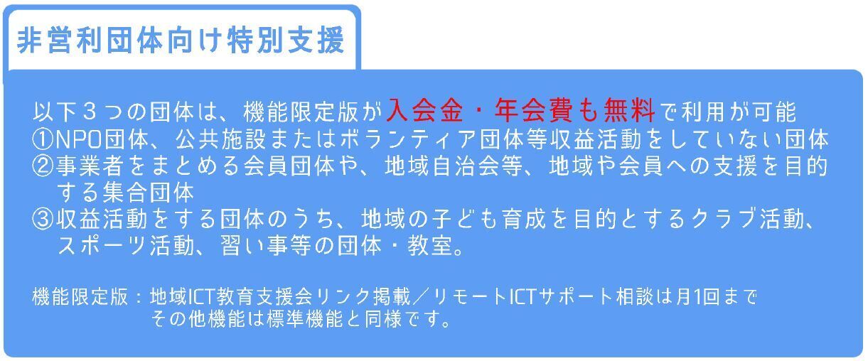 ちたリンクは、非営利団体向けへの特別支援制度があります。以下のいずれかに該当する団体は、機能限定版ですが、入会金・年会費も含めて完全無料でご利用いただけますので、0円でホームページ公開が実現できます。① NPO団体、公共施設またはボランティア団体等収益活動をしていない団体② 事業者をまとめる会員団体や、地域自治会等、地域や会員への支援を目的とする集合団体③ 収益活動をする団体のうち、地域の子ども育成を目的とするクラブ活動、スポーツ活動、習い事等の団体・教室※機能限定版 ・地域ICT教育支援会のリンク掲載 ・リモートICTサポート相談の回数 月1回までその他は標準機能と同じです。無料ですが会員扱いですので、オプション機能はご利用いただけます。リンク掲載されているため、オプション費用は全て半額で利用ができます。地元の団体様、ぜひご活用ください。※事前お申込みをいただける場合は、前回の活動報告で告知したオンラインセミナー申込フォームで資料のみ請求が可能です。