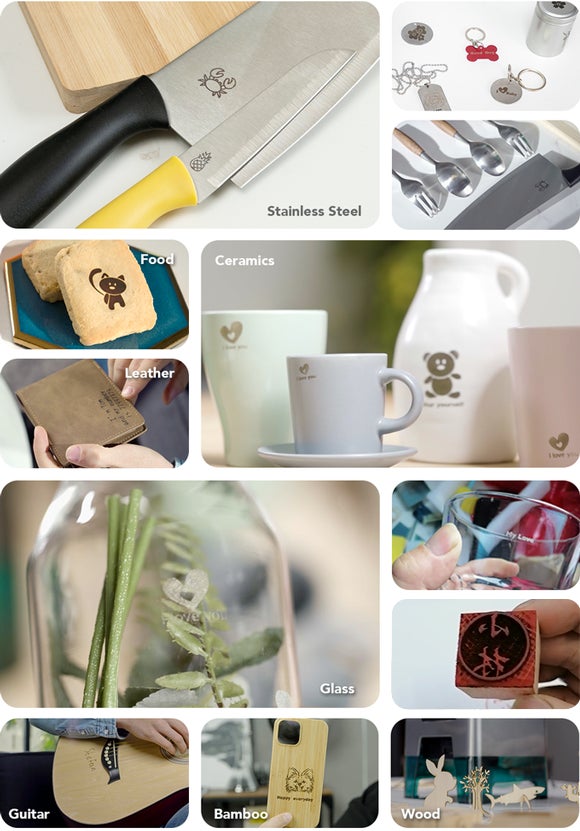 Runmecyは、ほとんどのものに刻印や切断ができます。ステンレス鋼、陽極酸化アルミニウム合金、酸化鉄、ガラス、セラミック、木材、竹、紙、アクリル、革、石、セメント、果物...