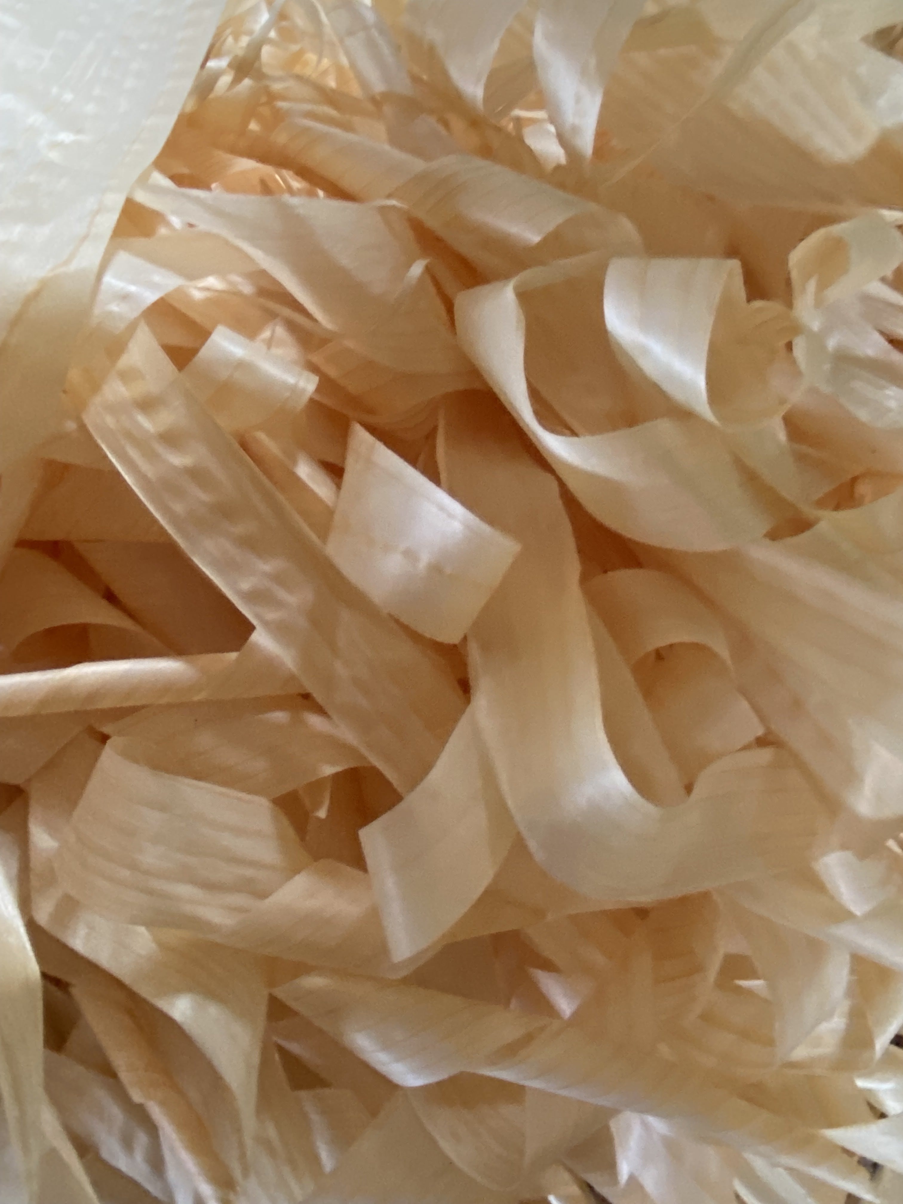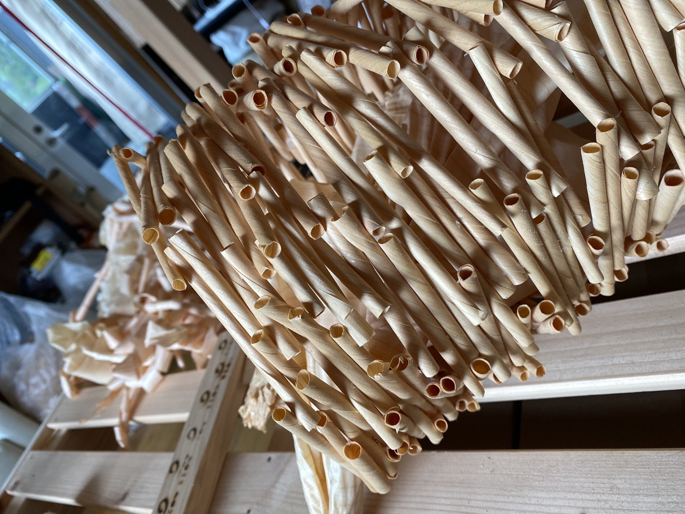 一枚一枚つないで薔薇にして正月飾りにしてみました。今は一年中飾っていますが(笑)日が経つにつれ、艶が増して硬く綺麗な飴色になる。こんなに感動させる事が出来る素材なのだから、もっとすごいものを作りたい。色々カンナクズで遊んでいると、新聞紙でくるくる棒を作って遊んでいたことを思い出しました。