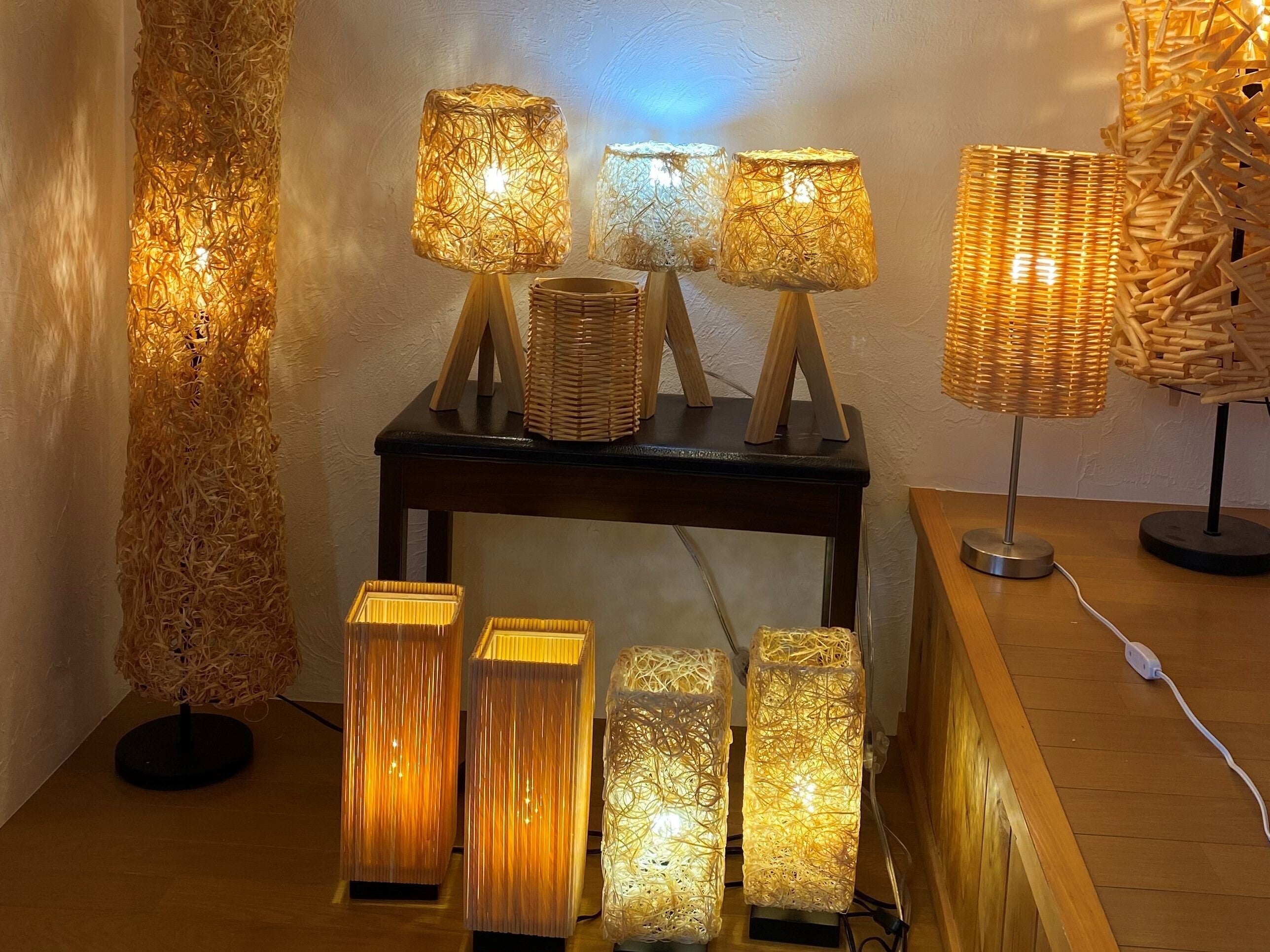 『ここのつ』のインテリアは建築資材から生まれた“呼吸するインテリア”です。職人の手で一枚一枚、独特の弧を描きながら生まれる『もしゃ』『くるり』『ひらり』は木材の風合いと香りをそのままに、繊細な優しい光で空間を包み込みます。