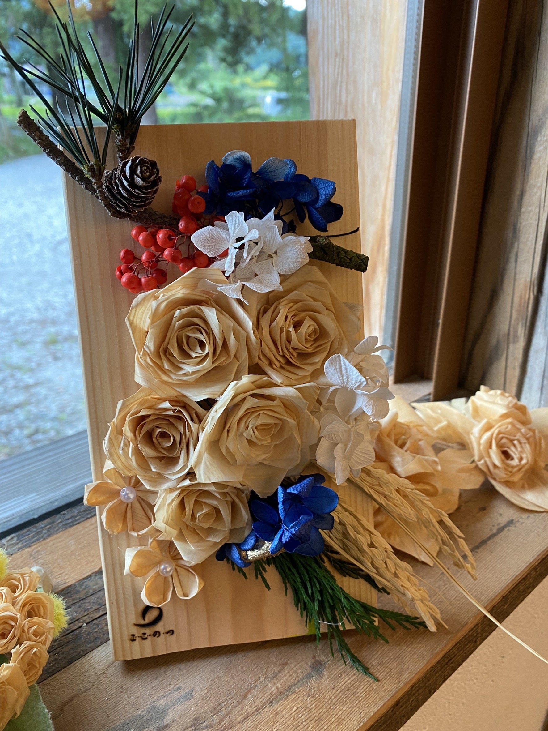 カンナくずを初めて手に取った時はすぐにボロボロになってしまうし、単なる遊び道具にしかならないと思っていました。とりあえず、リボンの様な形状なのでリボンで作る様に薔薇を桧のカンナくずで作ってみました。これが、思った以上に可愛くて、新築内覧会や新築お引き渡しの際花束にしてお客様に配ったところ、皆様も大変喜んでくれました。
