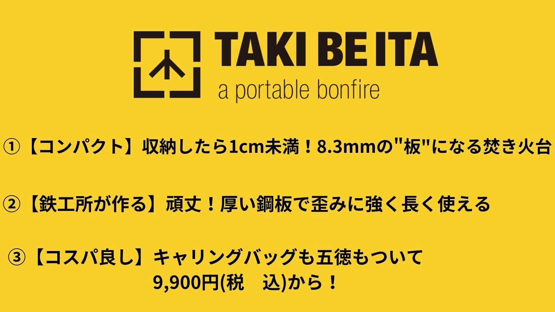 今回初めてCAMPFIREに登場するのはTAKI BE CANの弟分「TAKI BE ITA(焚火板)」です。ホーロー仕上げで4色のカラーから選べるスタイリッシュな兄に比べて、無骨なイメージの「TAKI BE ITA(焚火板)」です。