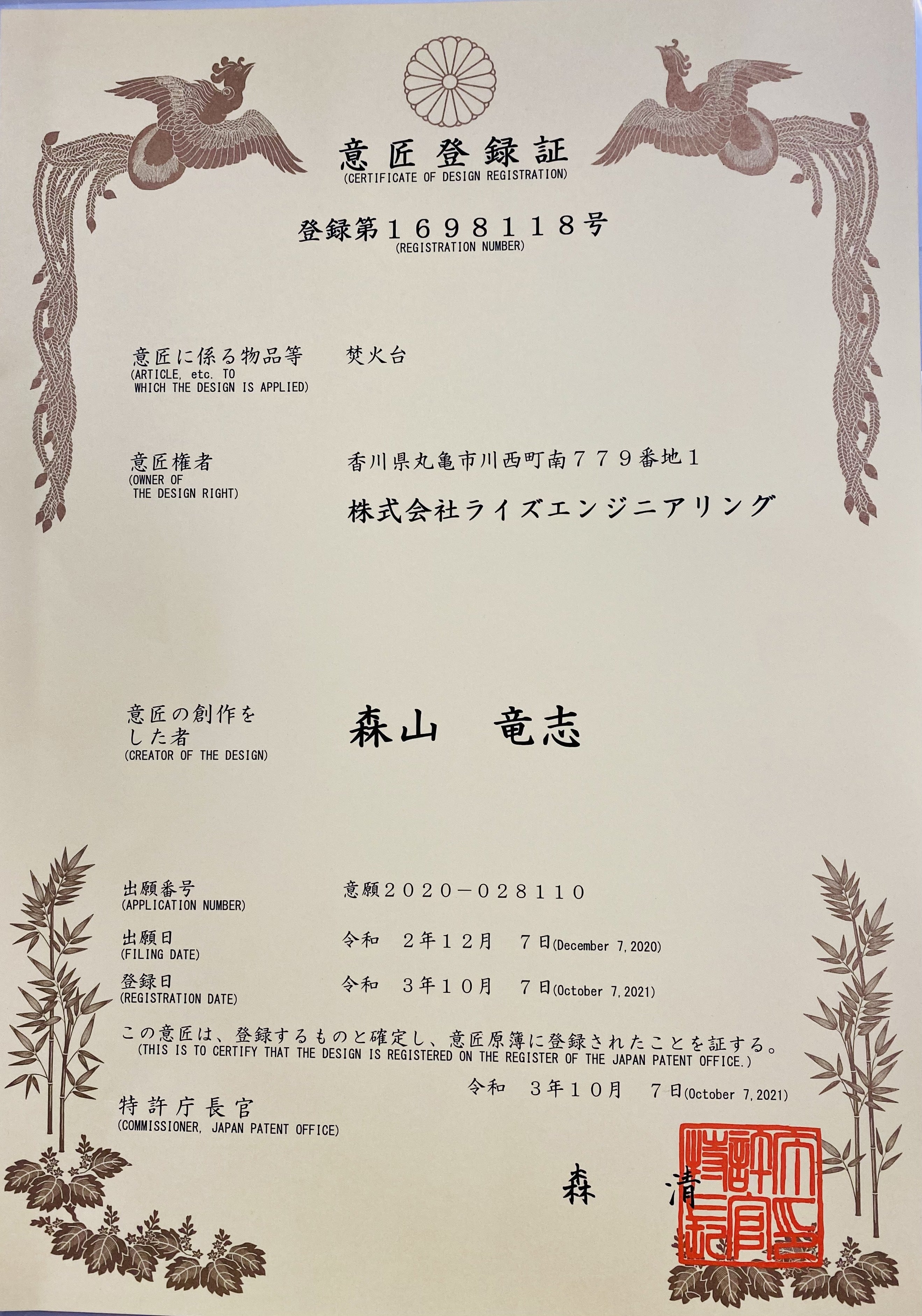いつも当プロジェクトをご覧いただき誠にありがとうございます。残すところあとわずかとなりましたが身も心も引き締めて最後まで頑張りますので応援よろしくお願いいたします。さてここで皆様にご報告がございます。じゃじゃーん!皆様にご支援いただいております【TAKI BE ITA 】が意匠を登録することができ特許庁より正式に意匠登録証を頂きました。詳しくは下記より検索していただき閲覧することが可能です。特許情報プラットフォームお届けまでに少し時間がございますが今年のキャンプは是非【TAKI BE ITA】を使ってCAMPを楽しんでください(*^^)v引き続き最後までよろしくお願いいたします。_(._.)_THE IRON FIELD GEAR