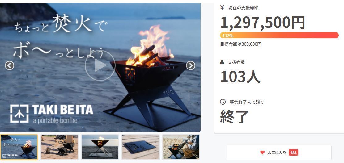【THE IRON FIELD GEAR】のプロジェクトをご覧いただき誠にありがとうございます。無事に目標を達成することができひとまずご報告とお礼申し上げます。秋の涼しさが心地よく爽やかな秋晴れとなり、焚き火をするのには最高の季節となりました。山で紅葉を見たり海辺で沈む夕日を眺めながらのCAMPも素敵ですね。今年からCAMPデビューの方も焚火台初デビューという方もコロナ対策万全でCAMPを楽しんでくださいね!まだまだプロジェクトは続きますが皆様何卒よろしくお願いいたします。(^▽^)/プロジェクト表記に関してお問合せがございましたのでご報告いたします。送料の記載がなく誠に申し訳ございません。送料は無料でございますのでご安心ください。_(._.)_THE IRON FIELD GEAR