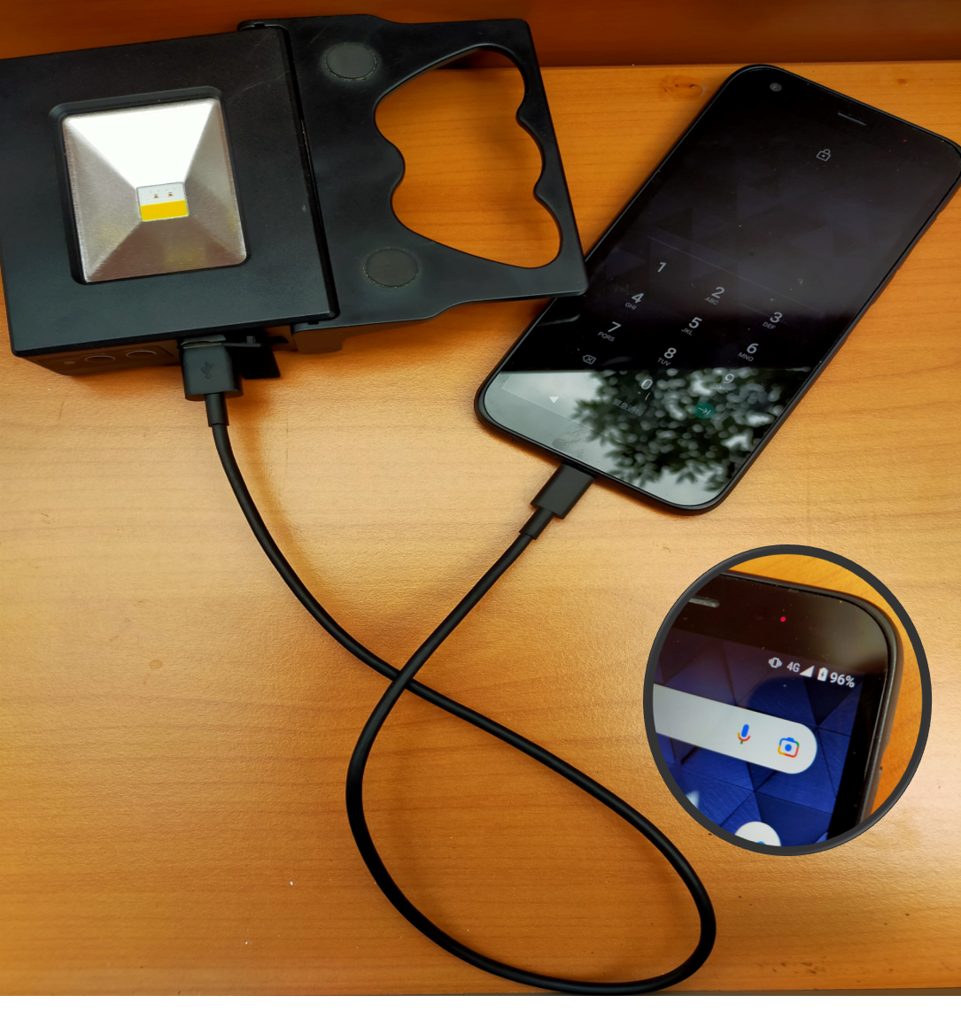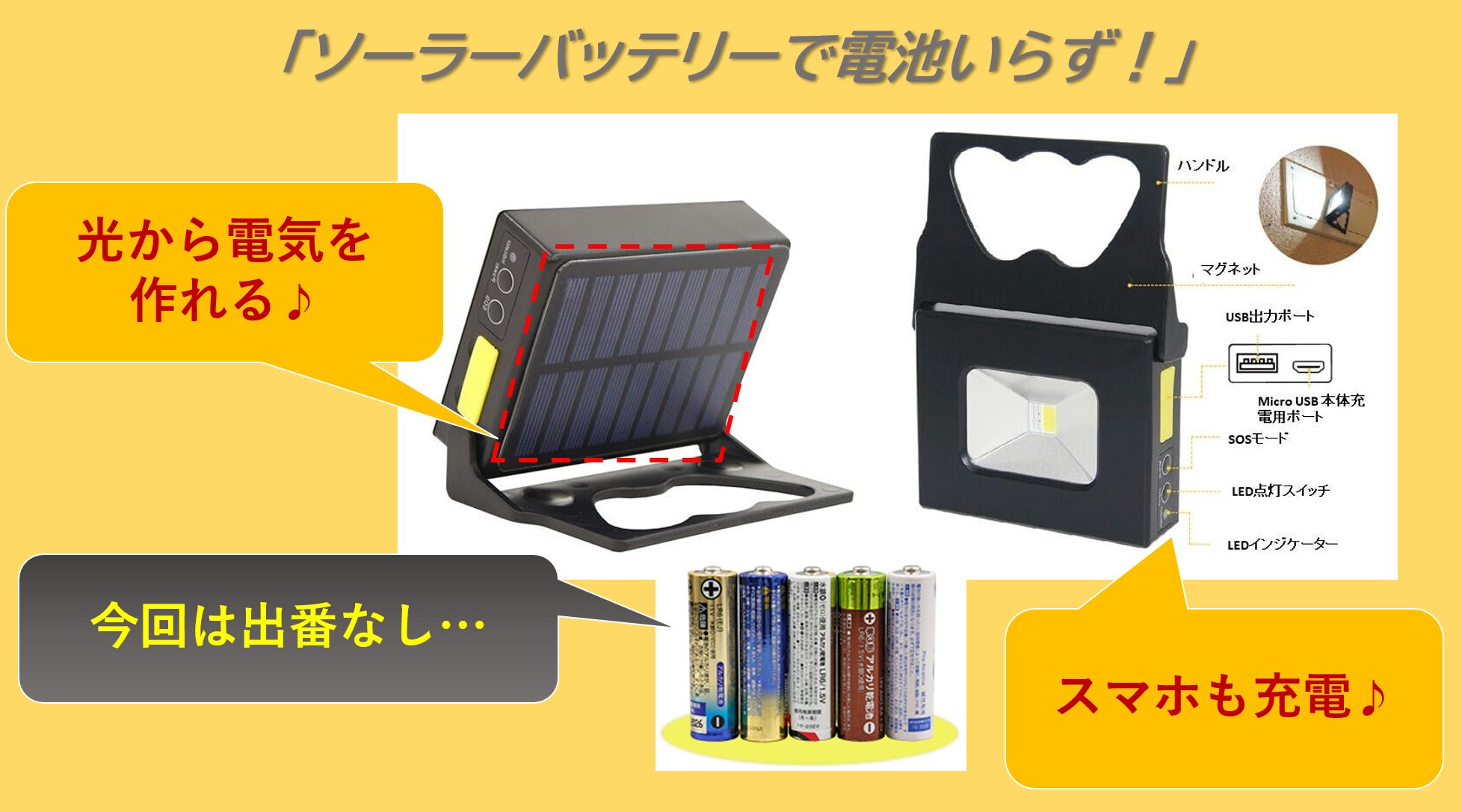 ソーラー発電以外にUSB充電も可能!