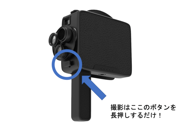 操作はとっても簡単!フロント部分についているシャッターを長く押すだけ。「カシャカシャカシャ」というフィルムが回っているような音が耳元で小さく響きます。