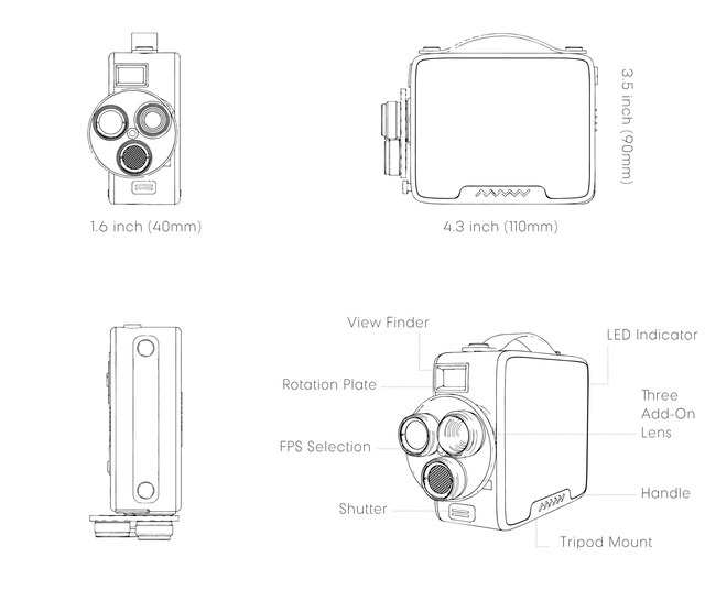 8mmフィルムが入っているわけではなく、動画はSDカードに記録されます。個々の撮影動画は最長120秒。(ファイルサイズは2分の動画(MP4)で50MB、4秒のGIFは4MB)