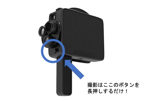 操作はとっても簡単!フロント部分についているシャッターを長く押すだけ。「カシャカシャカシャ」というフィルムが回っているような音が耳元で小さく響きます。