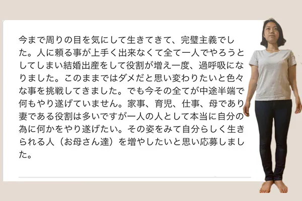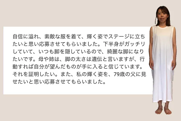 このファッションショーをきっかけに『自分の人生を歩く』と決めた一般人のモデルさんへは、私と特別講師陣が3ヶ月間、セルフマッサージ、食事指導、メンタルケア、ウォーキングのサポートをします。