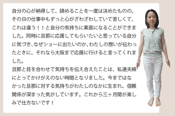 夢を諦めきれず30代半ば、仕事を退職し学校に通いましたが、その時受けた体型についての心ないフィードバックを理由に夢の職業へのあと一歩を、未だに踏み出せずにいます。(姉としては、夢を叶えるために仕事を辞めると決めた決断に感動し、心から嬉しい!応援したい!と思いました。)