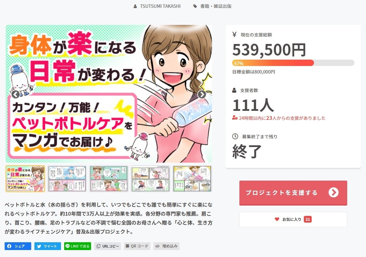 構想約半年、準備期間約3ヵ月、45日の活動が、昨日無事に終えることができました。これもひとえに皆さんのおかげです。心より御礼申し上げます。最終的に、間に合わなかったという方からもご支援をいただきまして、64万500円という金額になりました。金額抜きに100名を超える方に支援をしていただという事実はそもそもの目的である「ペットボトルケア」を沢山の方に知っていただくという目的を達成できたということで本当に嬉しく思っています。お一人お一人にお礼のメッセージとリターンの案内を順次差し上げていく予定です。引き続き、これからマンガの制作、そして活動報告を行って参りますのでどうぞ楽しみにお待ちいただければ幸いです。^^
