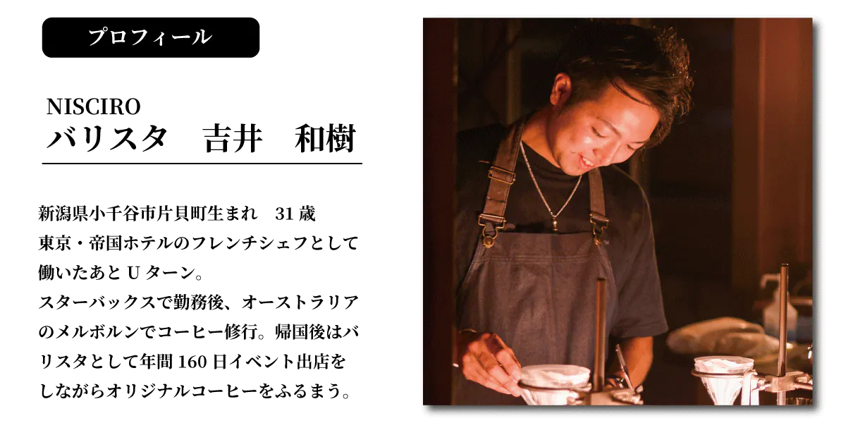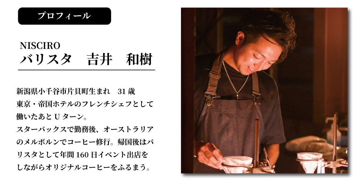 はじめまして、NISCIRO(ニシロ)のバリスタ・吉井和樹です。僕は花火と職人の町・新潟県片貝町に生まれました。