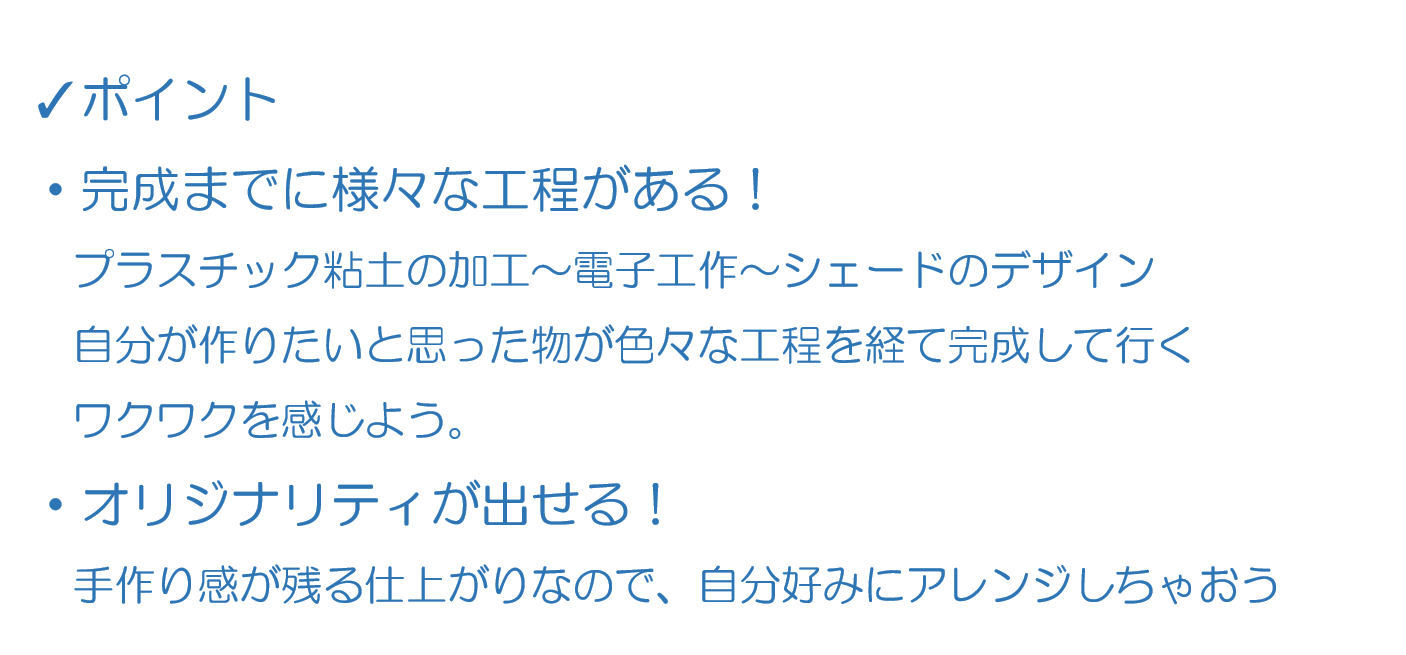 そして、なによりも「楽しい!私にも出来た」、「こんなものを作りたい」というワクワクする気持ちを育てる事が大切だと思います。