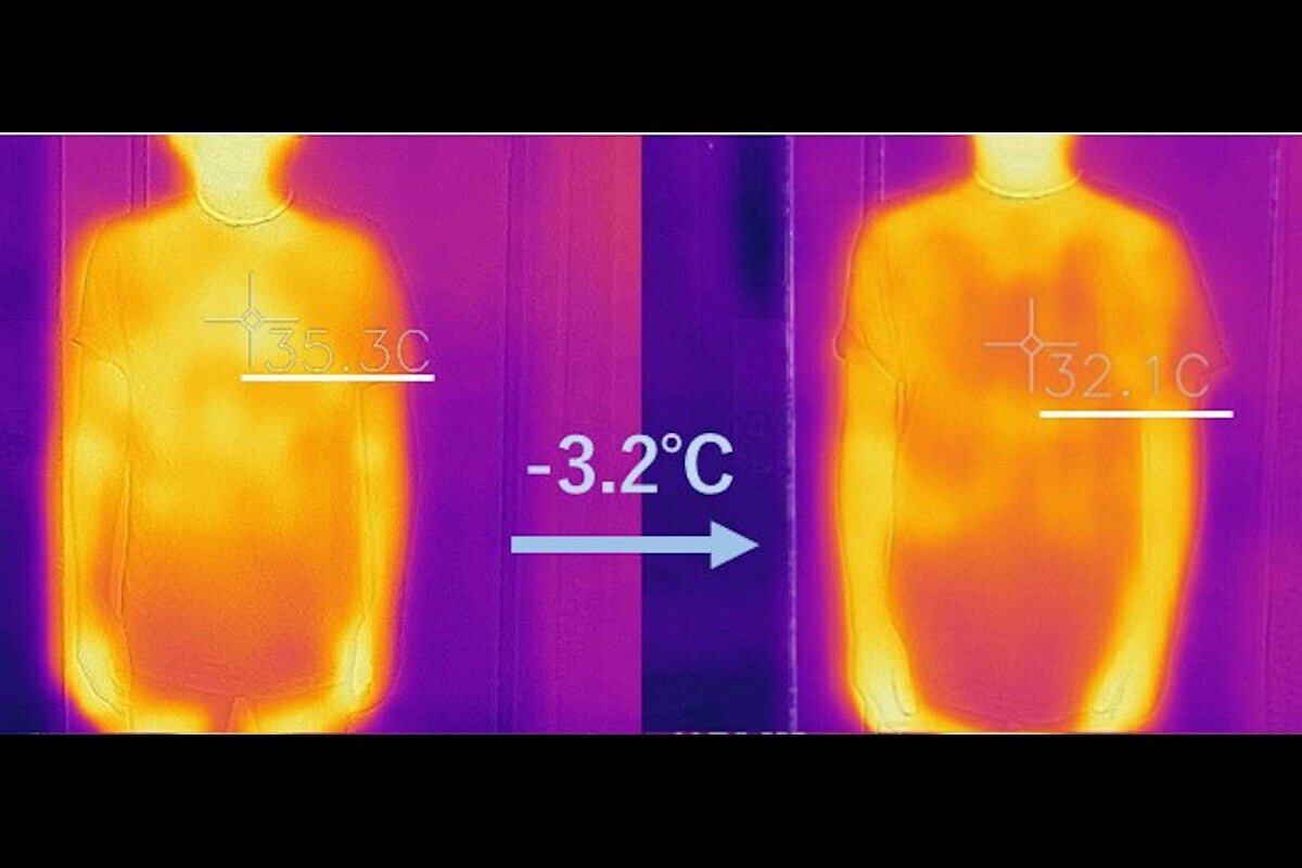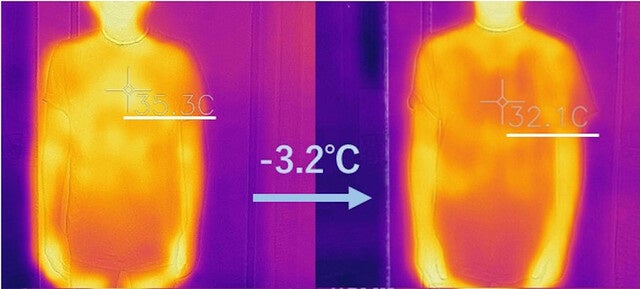 サーモグラフィーで確認すると、着用後30分で放熱効果で「赤」い部分が多くなり、-3℃以上の温度差を記録しました。