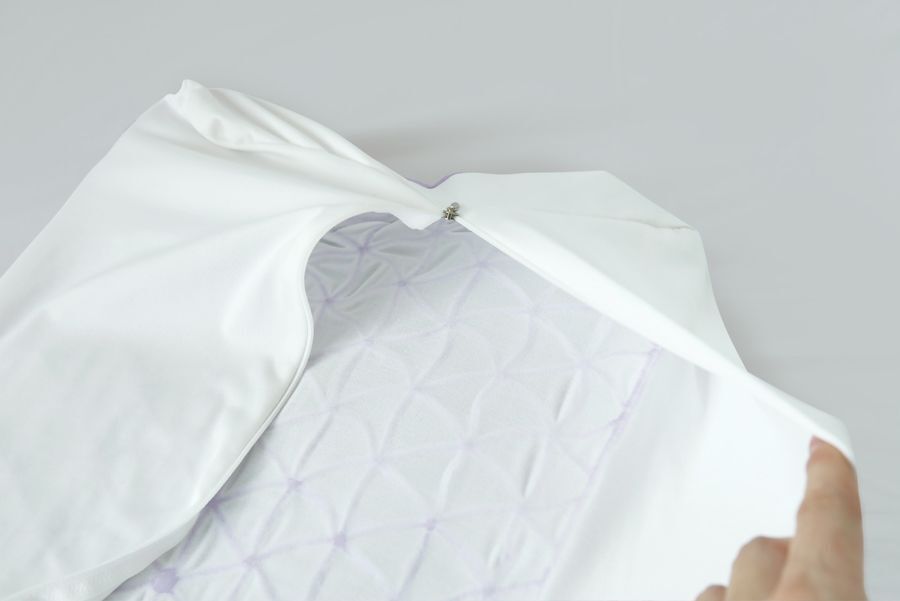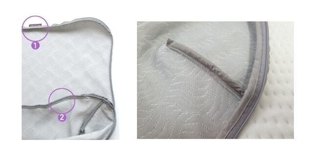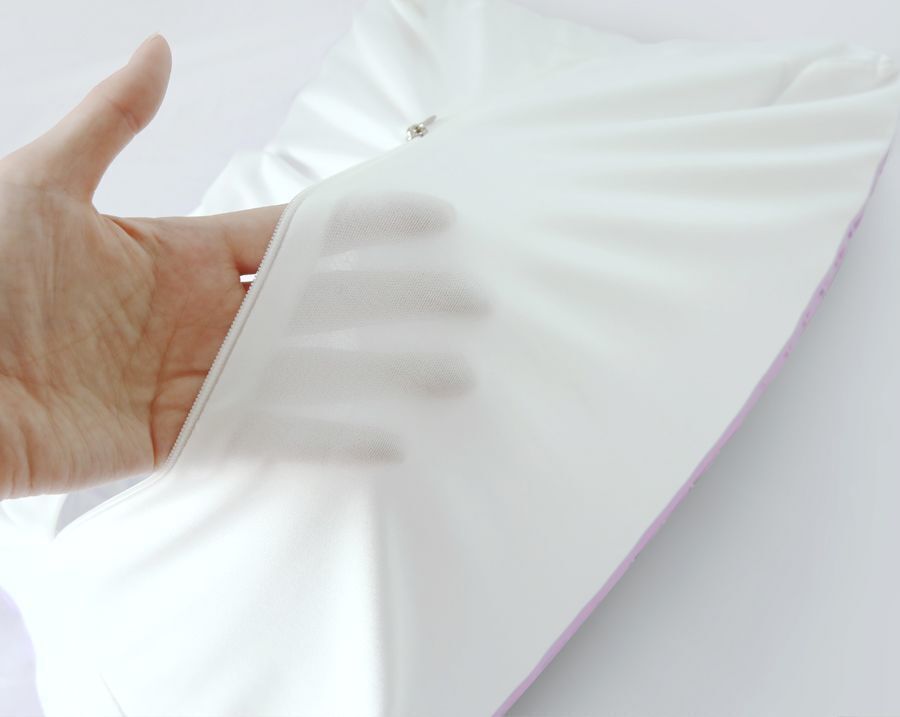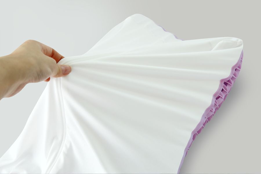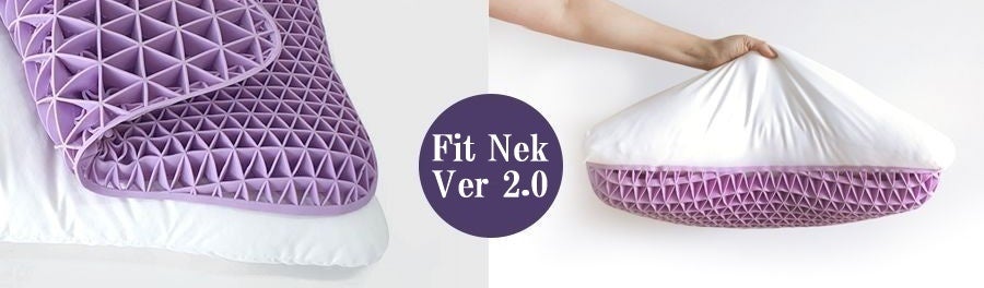 A. 初代『Fit Nek』は枕の上部TPE(紫の部分)と、枕の下部(MixFiber)が完全に分離していましいた。『Fit Nek Ver2.0』は、カバーの中でズレやすかった上部TPE(紫の部分)と、枕の下部(MixFiber)がずれないよう、枕の上部TPE(紫の部分)に薄いスパンデックス生地(伸縮性のあるナイロン生地)カバーを圧着し、枕の下部(MixFiber)をすっぽりと装着できるようになっています。