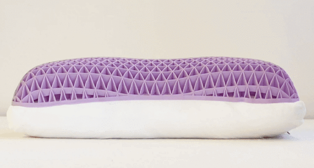 頭と首をやさしく包み込む、枕の上部TPE(紫の部分)と、高さの調整が可能でありながら頭の重さを支える枕の下部(MixdFiber)。