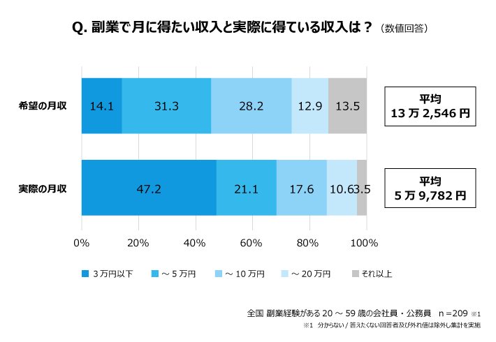 副業の希望月収は 13 万円だが、実際の平均月収は5万円というデータもあります。