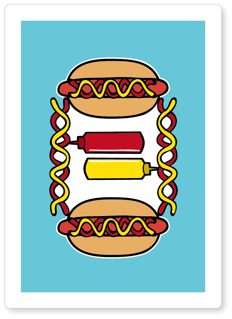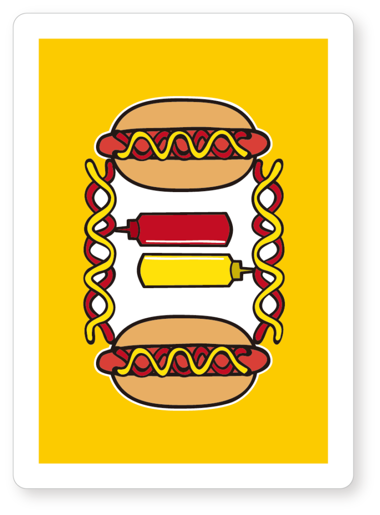 The hot dog deck のデザインは、一般的なトランプやマジシャンズトランプの幾何学的なデザインと異なり、ポップでシュールなテイストが持ち味です。特に絵札(J・Q・K)のデザインは他に類を見ないオリジナリティと可愛らしさが溢れたテイストに仕上がっており、ご家族やご友人、職場や学校でのトランプゲームに華を添えることは間違いありません。100%、何かしらのツッコミが入ると思われます。盛り上がりのきっかけにもなり得ますし、愉快なデザインのトランプはゲームの楽しさを増幅させるでしょう!