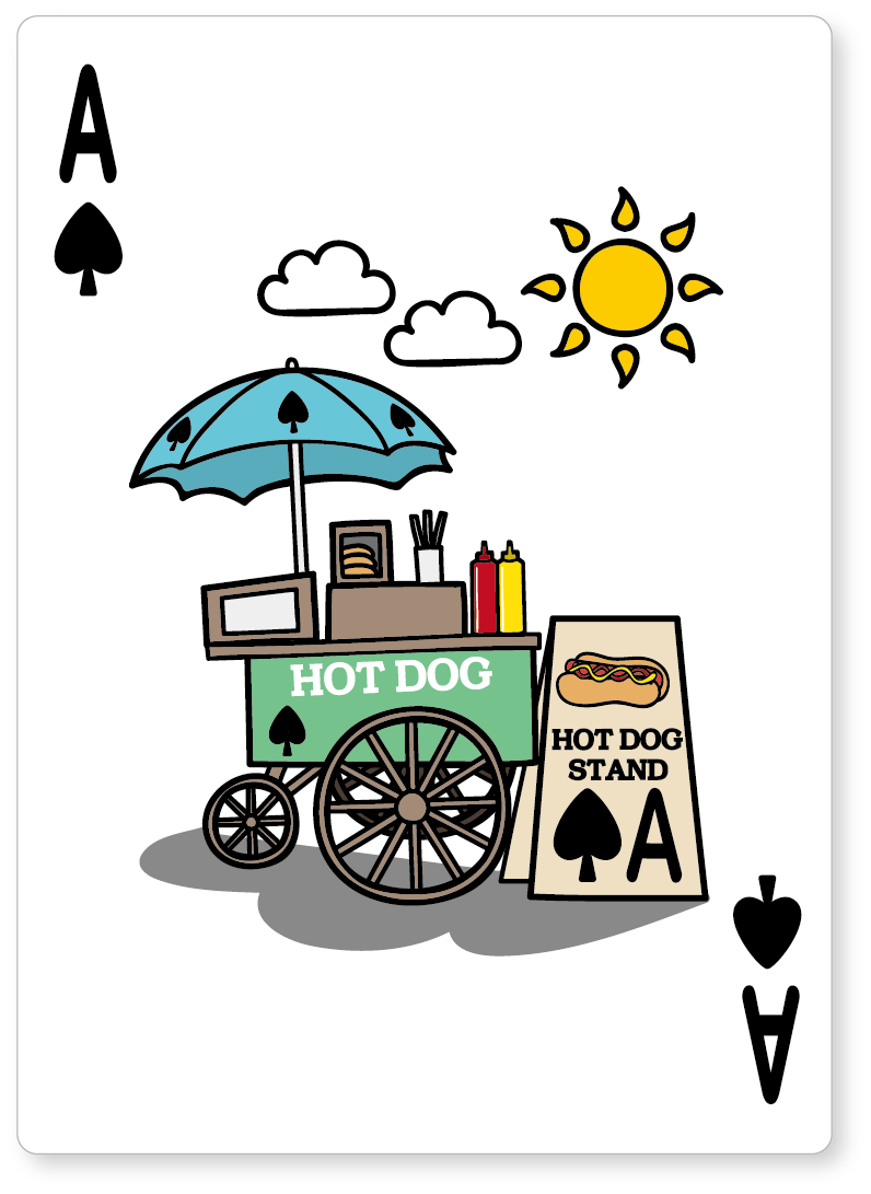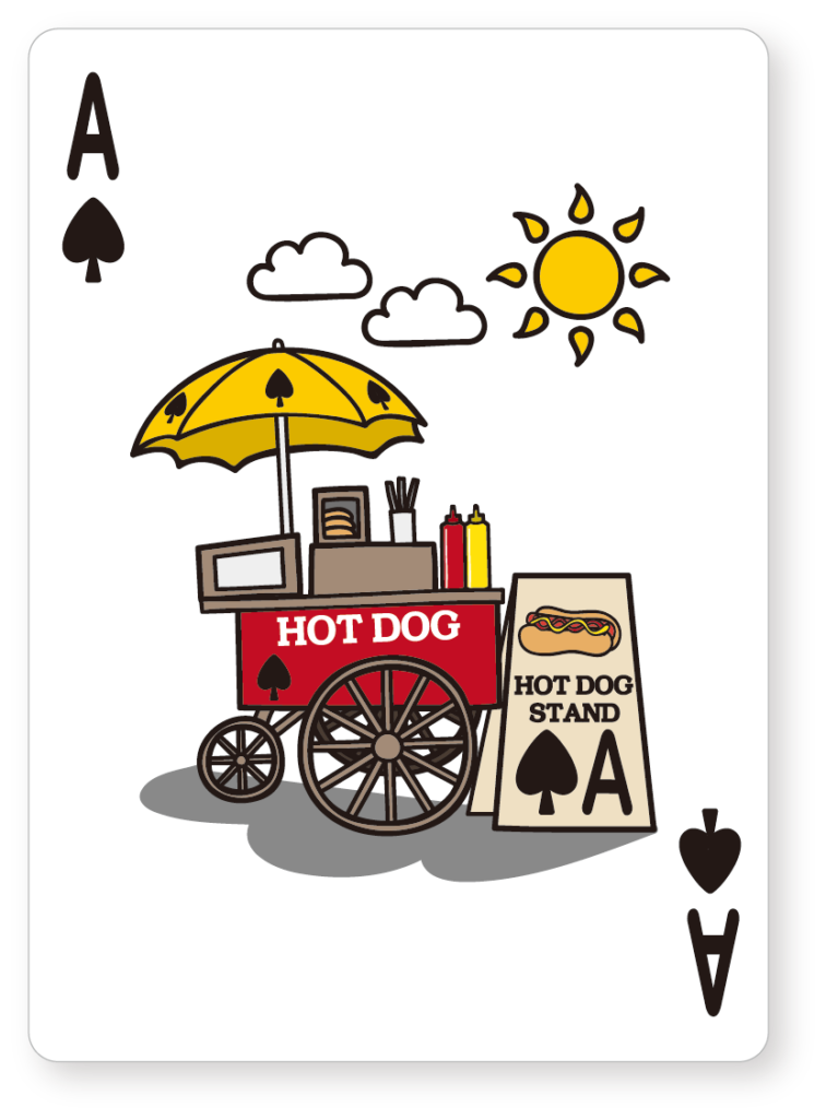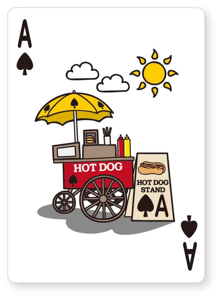 スペードのAには、赤と黄色が基調のどこかレトロな味わいを持った神聖なホットドッグスタンドが描かれています。