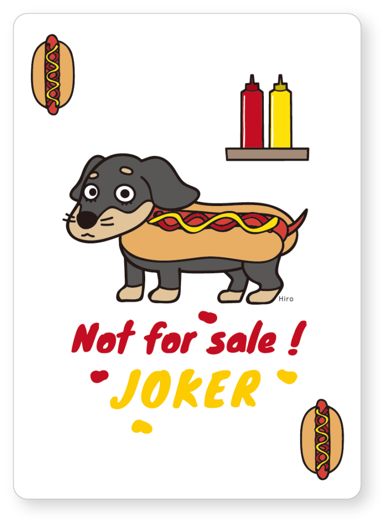 なんといってもジョーカーのデザインは特徴的です。ホットドッグの妖精(ワンコ)というキュートでシュールなキャラクターが効いています。インデクスがホットドッグ🌭の絵になっており、ホットドッグの主張が強めになっています。因みに、非売品の犬となっております。