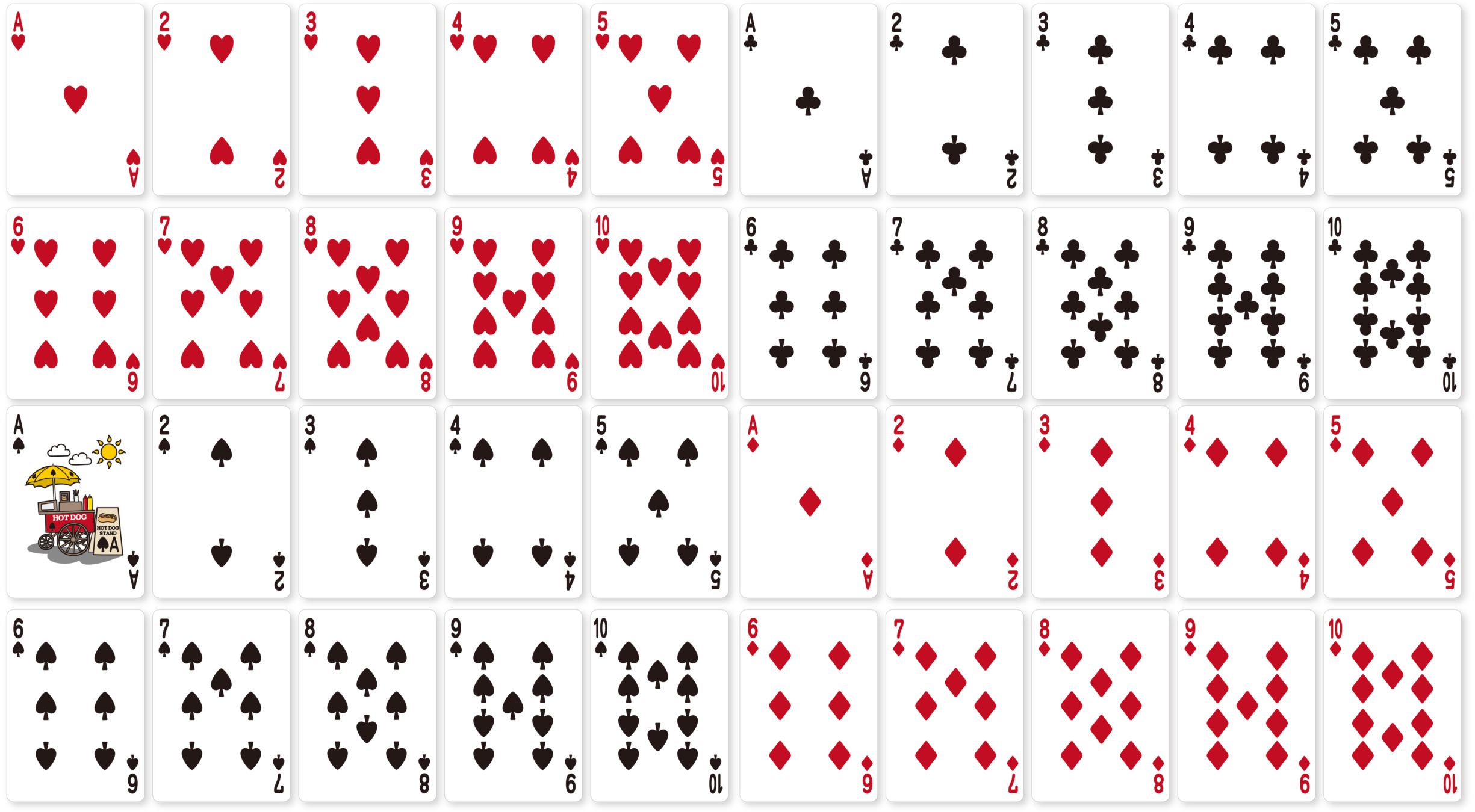 数札のデザインは、スート(記号のこと)の大きさが大きすぎず小さすぎず、ちょうど良いサイズになっております。また、The hot dog deck の可愛らしい世界観に合わせて、少し太くゆったりと描かれているので、視認性がとても高いです。丸っこく柔らかい調子のデザインはとても親しみやすいです。