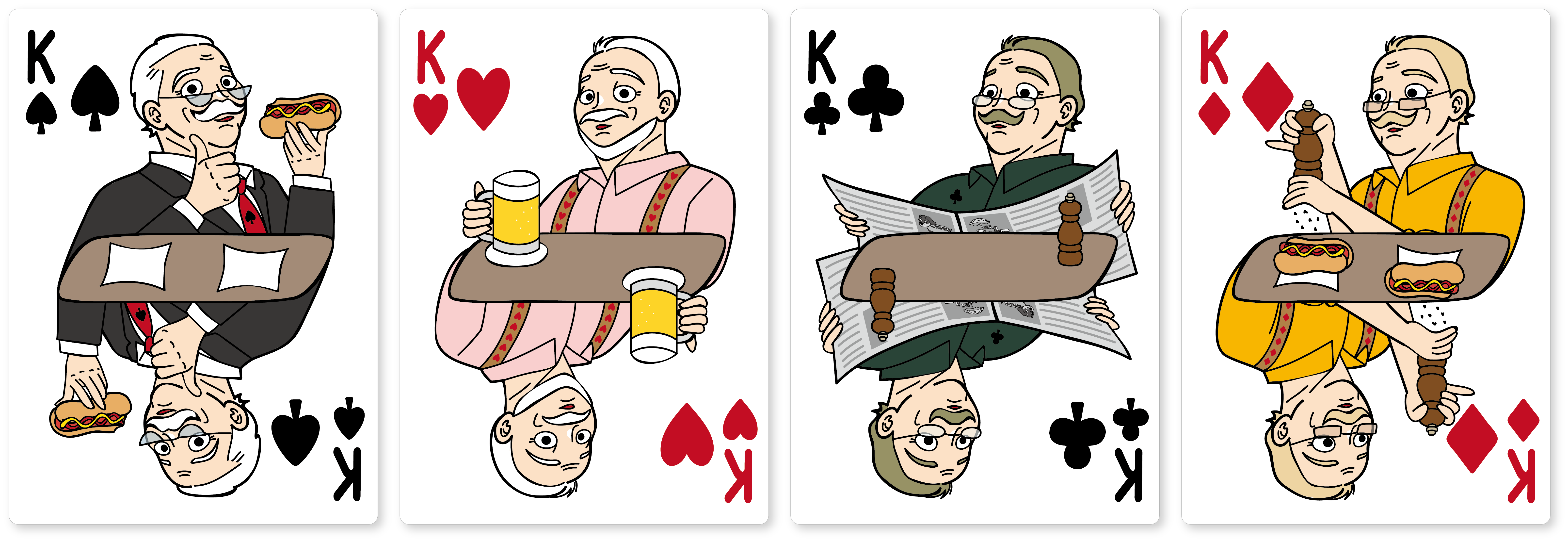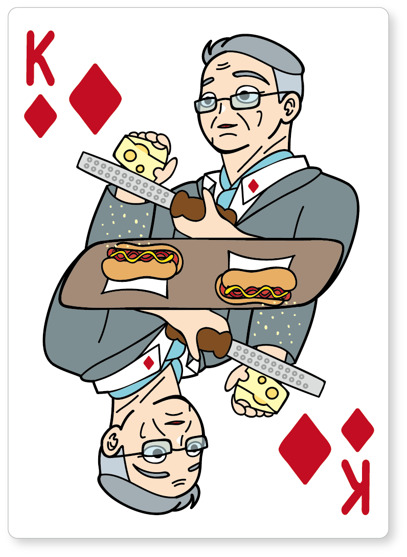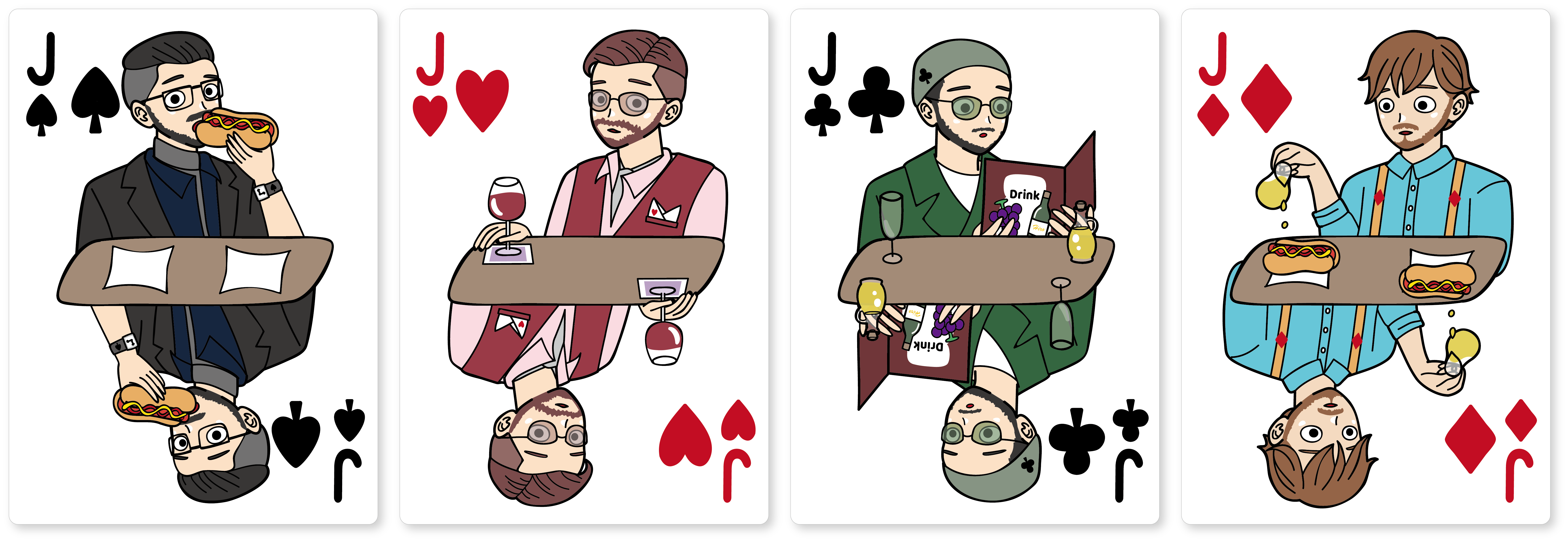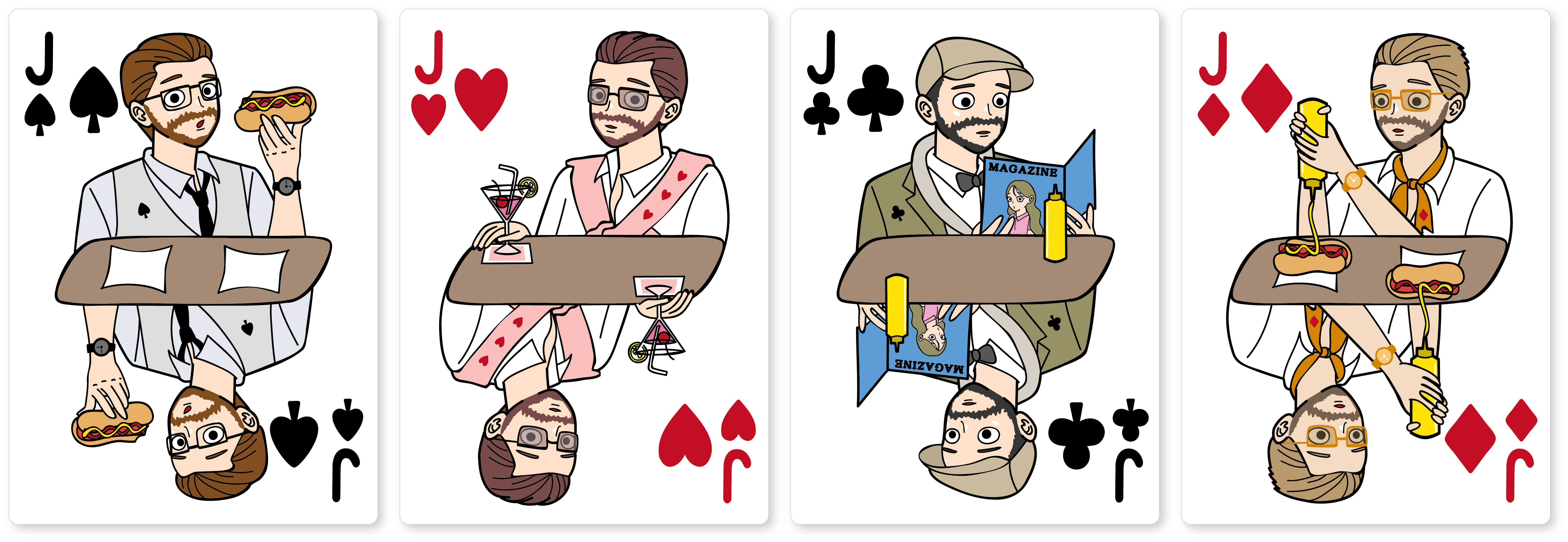 紳士なJackたちご一行 The hot dog deck を象徴するかのような、ポップでシュールなテイストの絵札は、やはり"ありそうでなかった"ユーモアに溢れたデザインになっております。立体的に描かれた、各々のランチタイムを楽しんでいるキャラクターたちには、今にも動き出しそうな躍動感に溢れています。一般的なトランプの絵札と見比べてみてください。The hot dog deck の絵札は絵を囲む枠を取っ払っており、ゆたっり感増し増しのデザインに仕上がっています。今までも、枠を取っ払ったキャラクタートランプはあったかもしれません。しかしながら、デザインの細かさ、世界観、品質をここまで追求したトランプは、この類のデザインの中では、まさに"ありそうでなかった"タイプのトランプではないでしょうか。