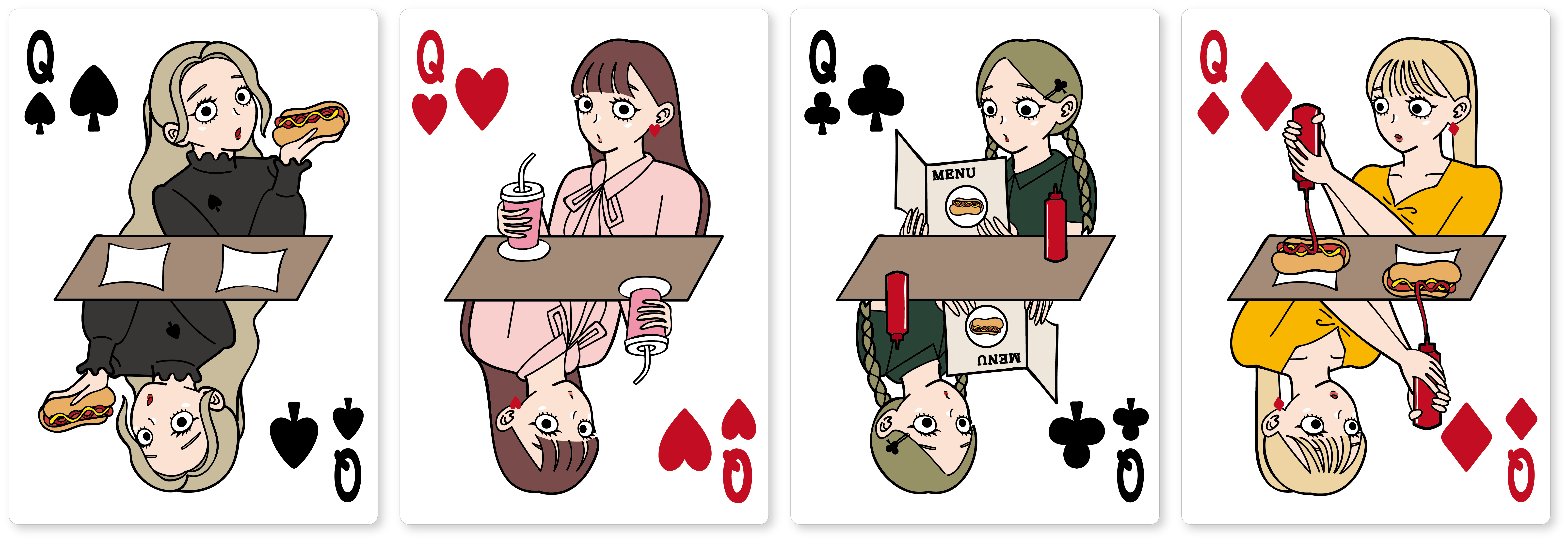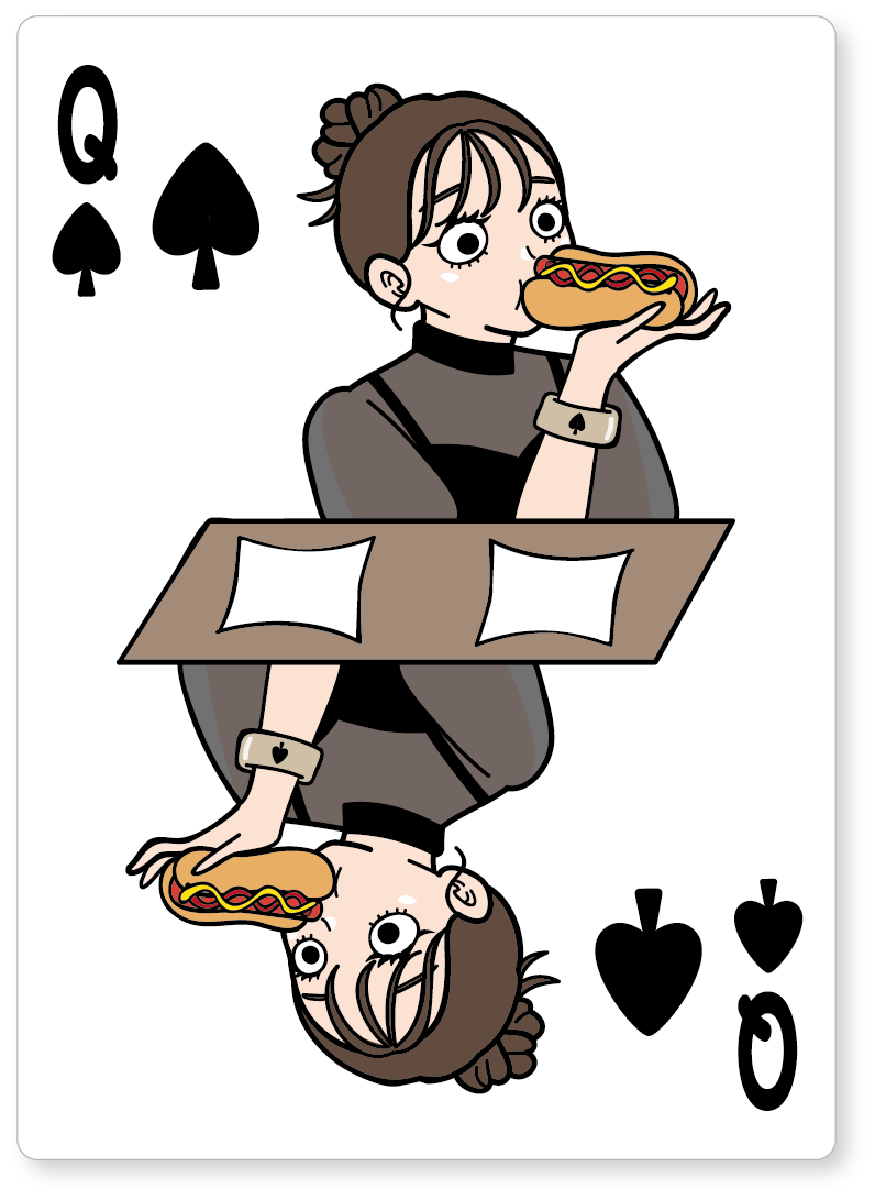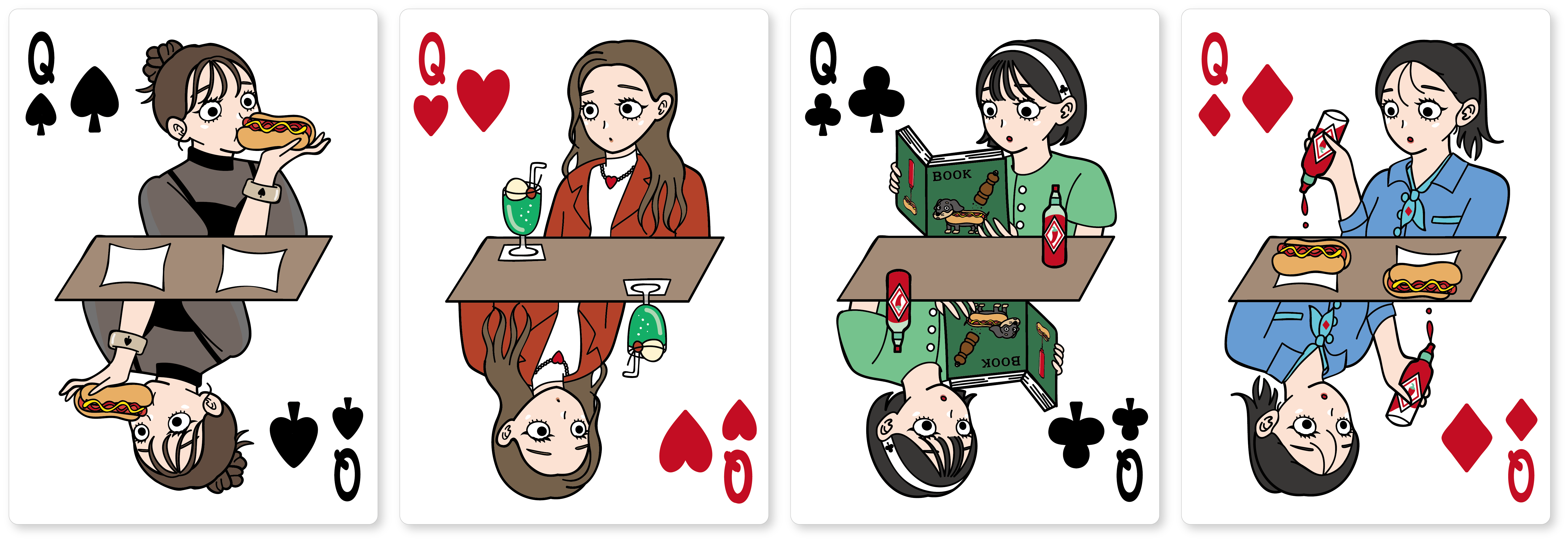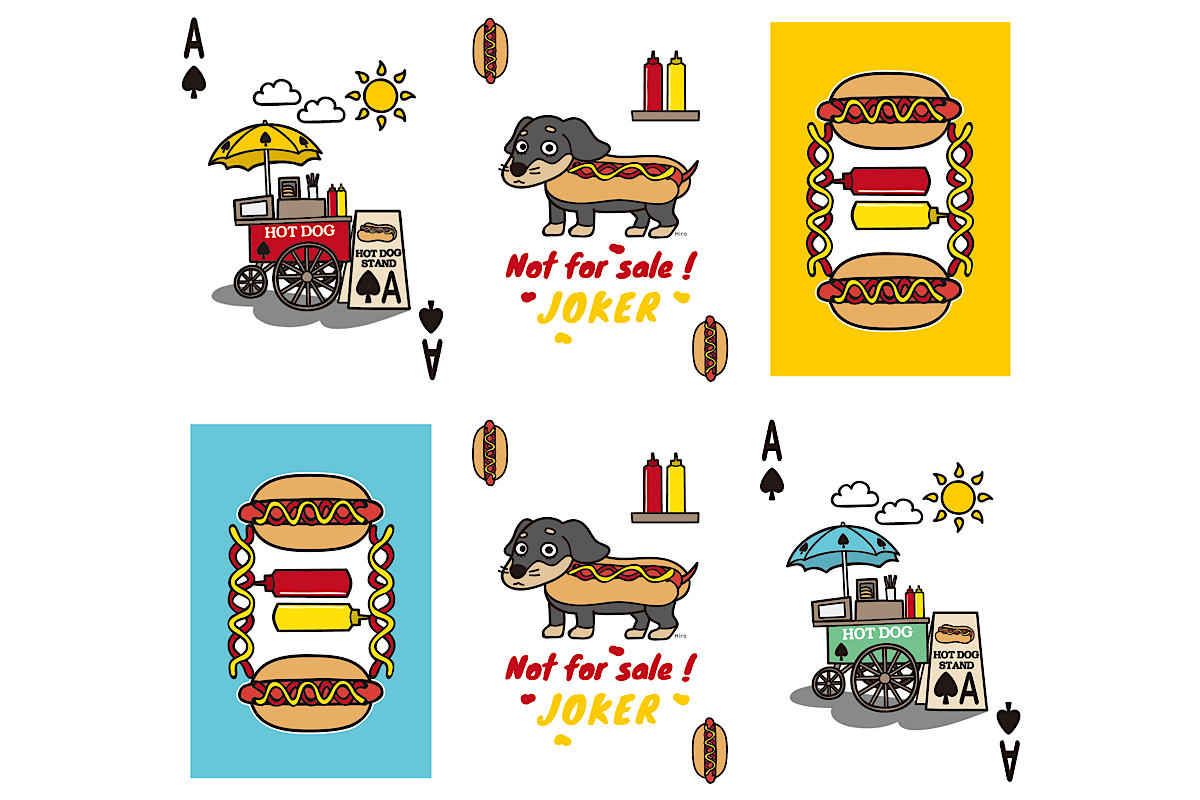 The hot dog deck1 のデザインがアメリカンポップなテイストであったのに対し、The hot dog deck2 のデザインは、アメリカンレトロなテイストに仕上がっております。ご覧ください、シックな背広を着込み、珈琲を味わいパイプ煙草をくゆらせ、ホットドッグには仕上げにチーズをまぶす老紳士(King)を。より清楚で洗練されたお嬢様方(Queen)は、クリームソーダを満喫しており、昭和感が漂っています。(失礼、レトロはレトロでも、アメリカンレトロなデザインでした。) スタイリッシュなファッションを身に纏い、ワインを嗜みながらホットドッグをほおばるJackを見ながら、"あぁ、こんなお店に行きたいなぁ。"と思ったあなたは、なんとまあ素晴らしいホットドッグワールド通の方なんでしょう。ユニークな世界観をご堪能ください。