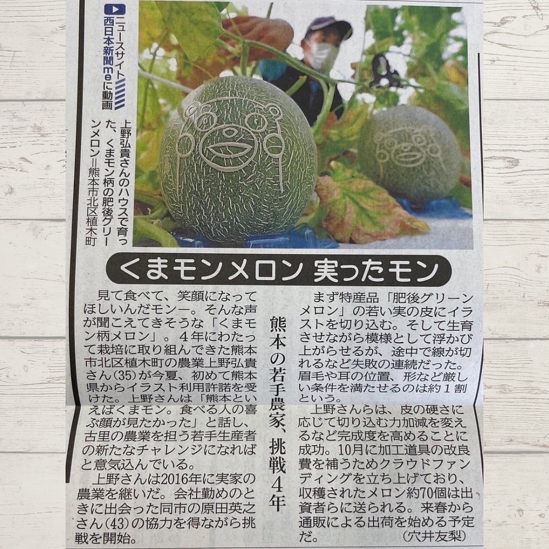 キャンプファイヤーのページを見て感銘を受けた!と西日本新聞社の穴井記者より取材を受け、掲載していただきました!!皆さまのご支援で押し上げていただき、ご縁をいただく事が出来ました!改めまして、感謝申し上げますm(__)m 電子版の記事はこちらをご参照くださいませ(^O^)↓↓↓https://www.nishinippon.co.jp/sp/item/n/829236/?utm_source=yahoo_relation&utm_medium=external_delivery&utm_campaign=ver01ーーーーーーーーーーーーーーーーーーーーーーいよいよ”くまモン柄のメロン”の出荷も本日(11月11日)を予定しております!!また出荷状況も、活動報告させていただきます!