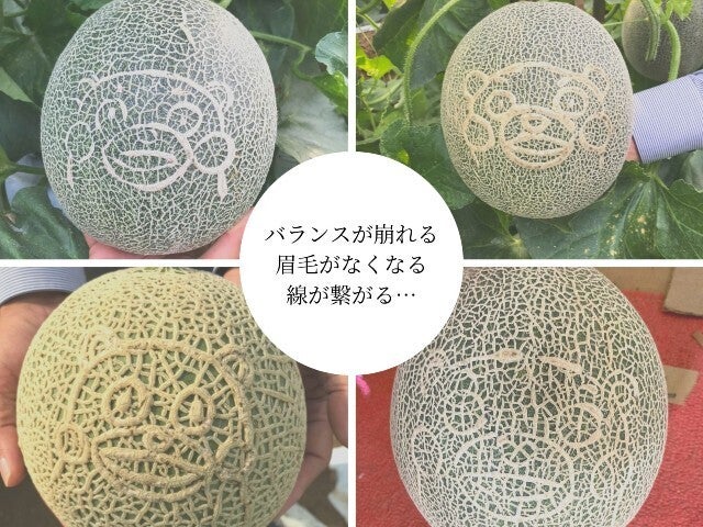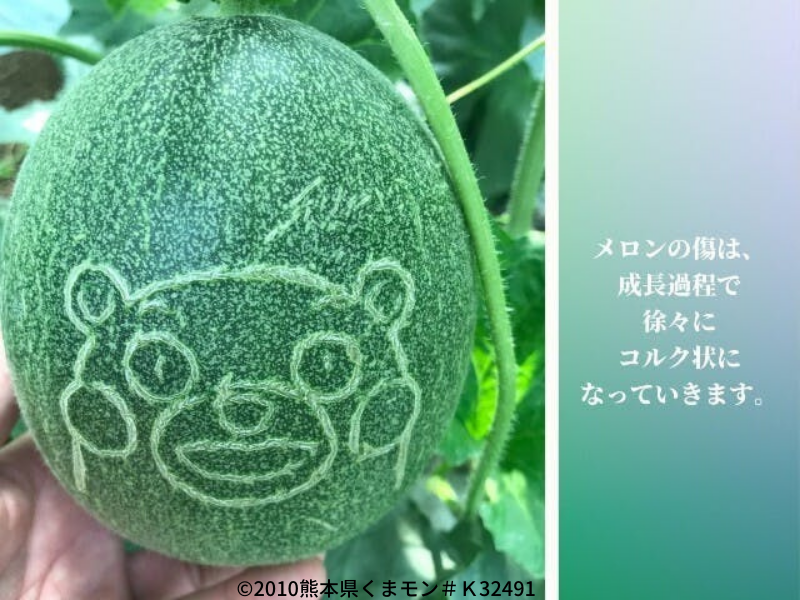 皮に傷がつくとコルク状に固まるメロンの特性を応用し、人為的に傷をつけることでくまモンの画を描きました。