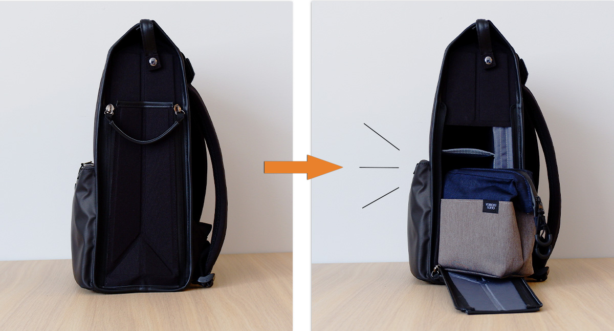 リュック側面をパカっと開くと、上からも横からも中身が見渡しやすい上段と、横から出し入れしやすい下段の2段構造になっています。また仕切りも折り畳むことが出来ます。