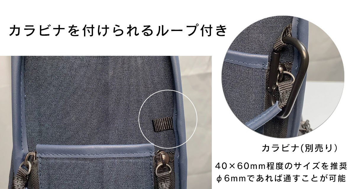(カラビナに関しては、横約40mm x 縦約60mm程度のサイズを推奨いたします。また、直径(φ)6mmであれば通すことが可能です。)