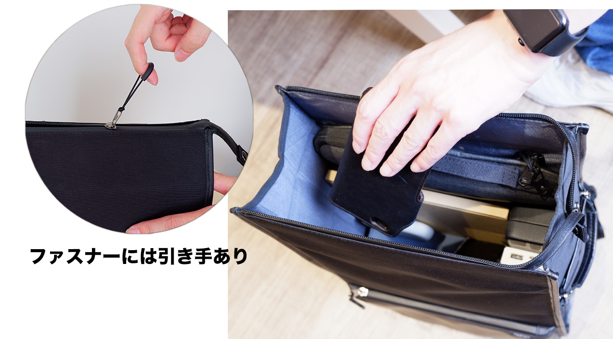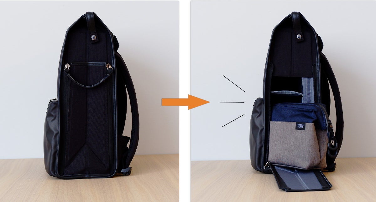 ※仕切り部分は簡単に折り畳める構造のため、PCポケット側に若干隙間が空く仕様となっています。詳しくは以下の動画をご確認ください。