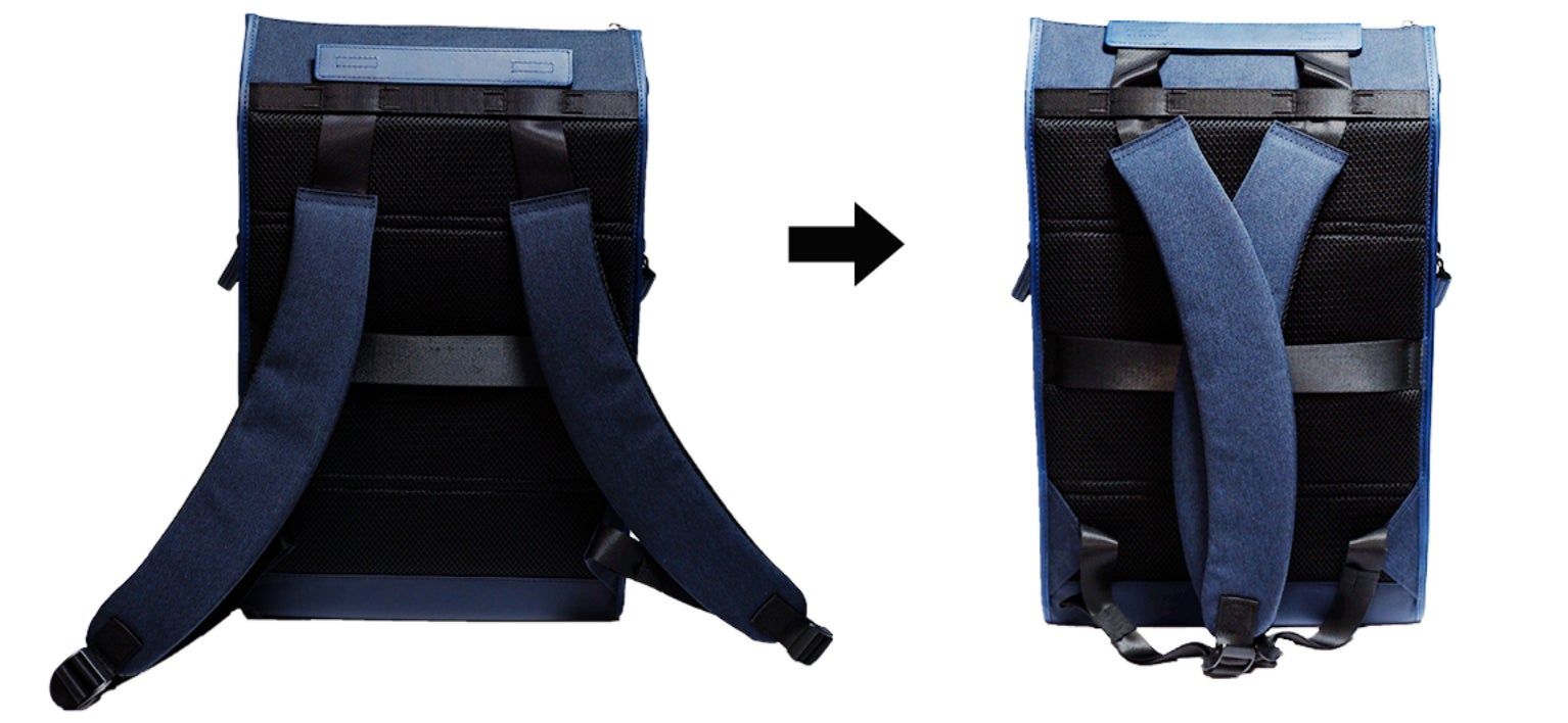 また、置いたときに邪魔になりがちな肩紐も、肩紐全体を上に引き上げることができます。