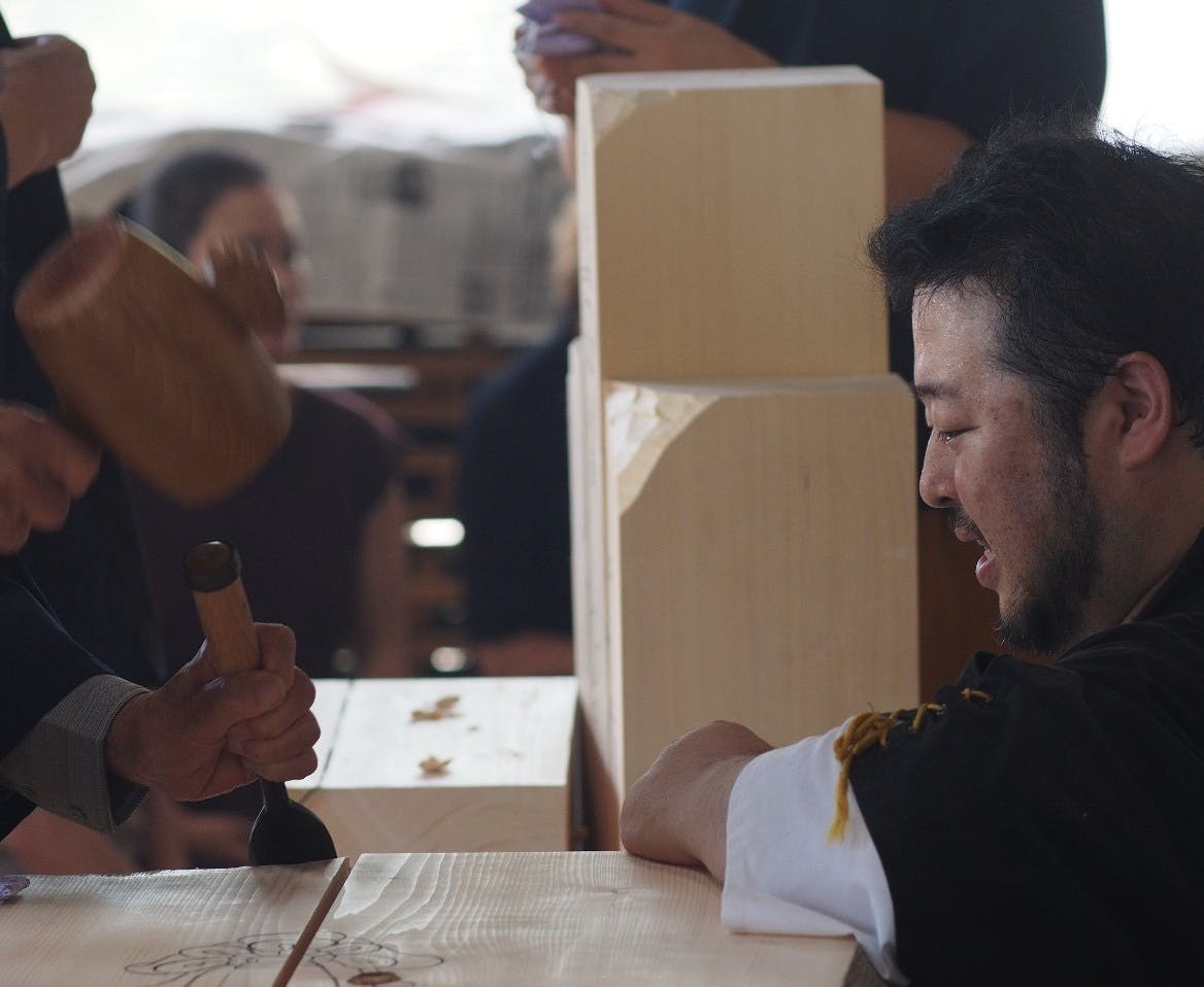 皆さん、木槌と鑿を手に取り観音様となる木曽檜を削りました。