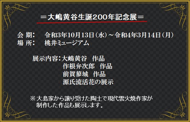 今年は大嶋黄谷の生誕200年を迎えます。秋には大嶋黄谷の作品をはじめ雲火焼の著名な作家の展示会を開催いたします。
