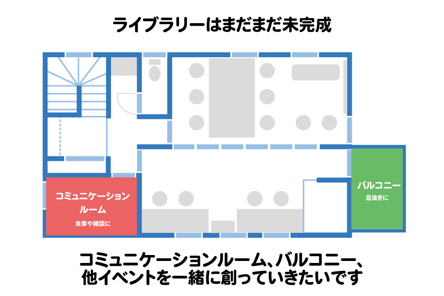 いつも応援ありがとうございます!ライブラリーの柴田です。いよいよこのクラウドファンディングも残り一日を切ろうとしています。この活動報告の執筆時点で38名の方々より支えられ、合計で65万円強のご支援をいただくことができております。本当にありがとうございます!!!!クラファンも終盤を迎え、お陰様で無事にオープンにも至れておりますが、ライブラリーはまだまだ未完成です。コミュニケーションルームと、利用者さんたちが一息をつくためのバルコニーがほとんど手付かずの状態です。倉庫と化してしまっているコミュニケーションルーム予定部屋隣のマンションとの目隠しを造って居心地をもっと良くしたいオープンという峠をひとまずは越えることができたので、早く完成させてしまいたい気持ちもあるのですが、少しずつこの中村橋でも新しく知り合えた方々もおり、また、実際に使う人の目線も交えて造っていけたらな、と思い始めてきています。クラウドファンディングが終了したら、ご支援いただいた方を中心にオンラインのグループを開設することを計画中です。リターンにも組み込ませてもらっている、オンラインコミュニティーです。ここで、皆さんの意見を伺いながら、また可能な方は一緒に手を動かしながら、みんなのスペースを創っていけたらと思っています。もちろん、任意参加となりますので、もしご興味がある方はぜひ楽しみにしていただけると嬉しいです。ではでは、今日も一日、ありがとうございました!明日はラストデイ!