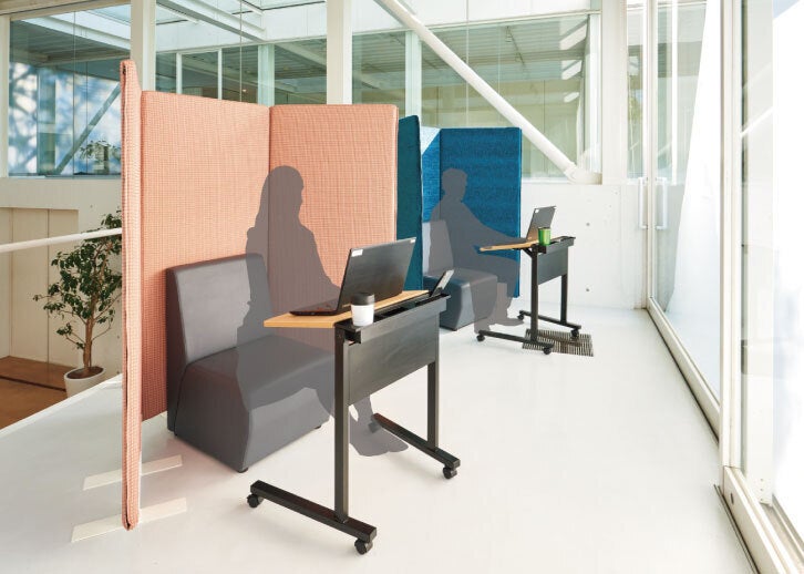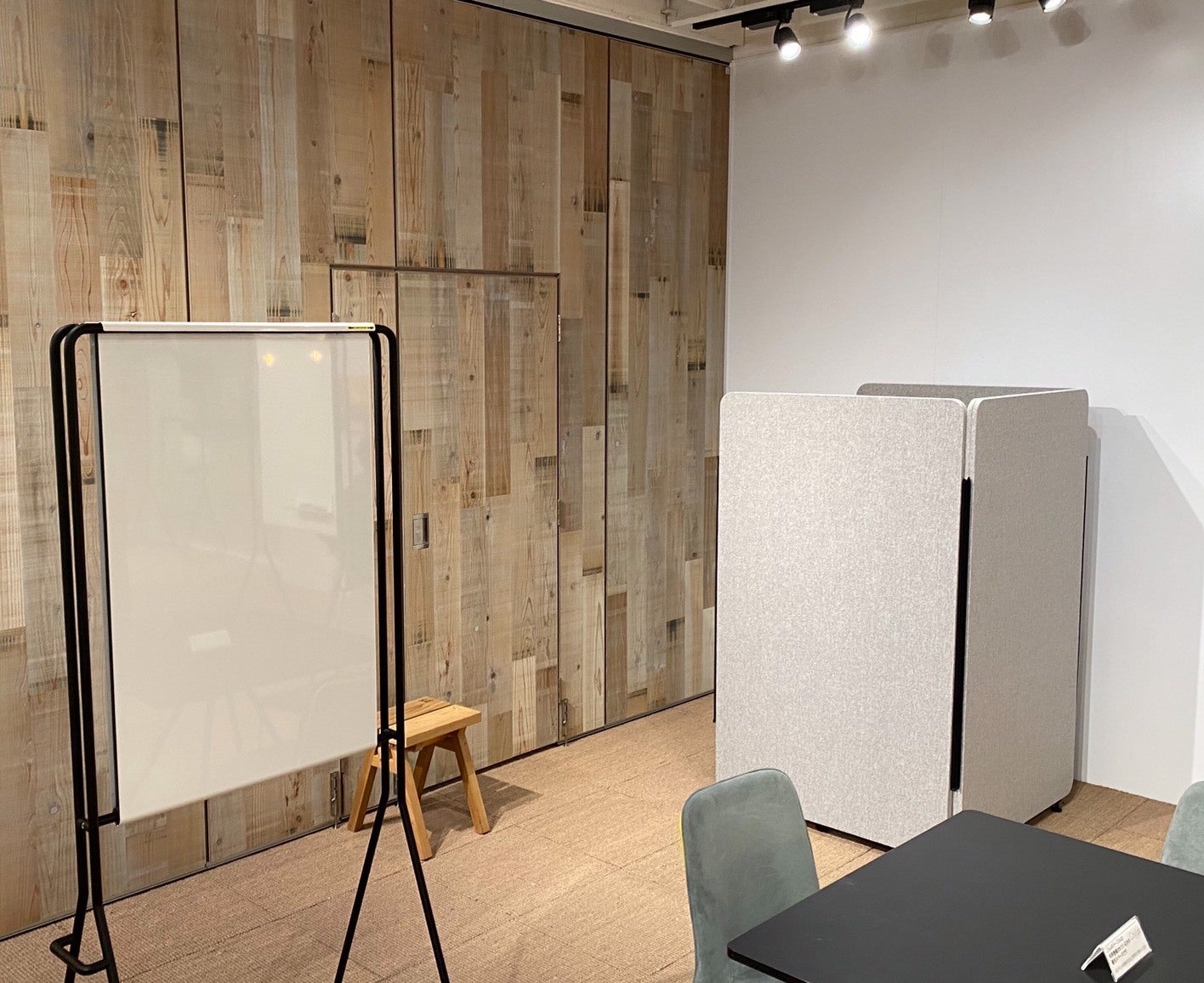 角を利用して、吸音パーテーションで仕切り、即席のリモート会議室を作ることができれば、もう2室増やすことができます。