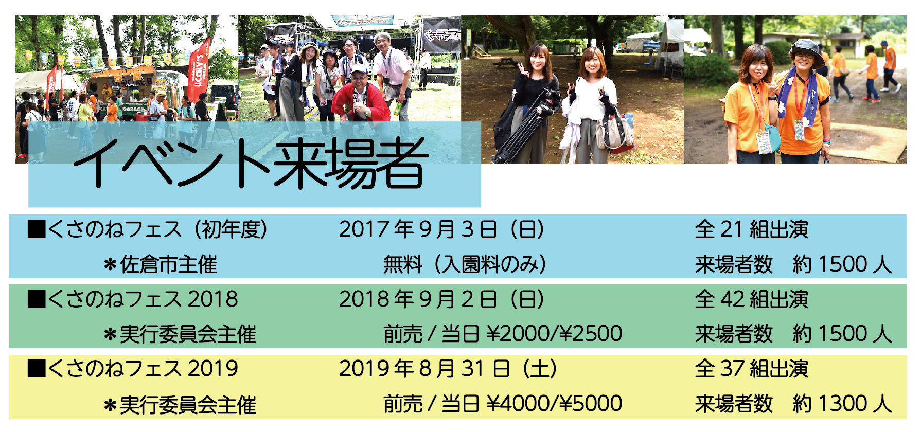 皆様のご協力により、イベンターなどを介さず、佐倉市との共催で民間の実行委員会が主催した「くさのねフェス2019」では、1300名以上の来場者、関係者とともに無事に開催することができました。