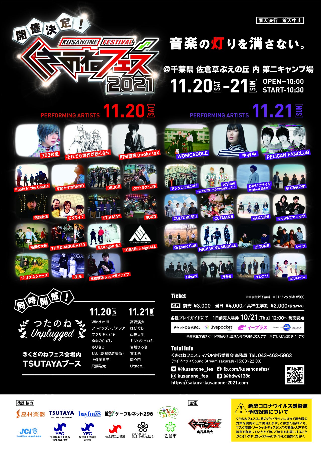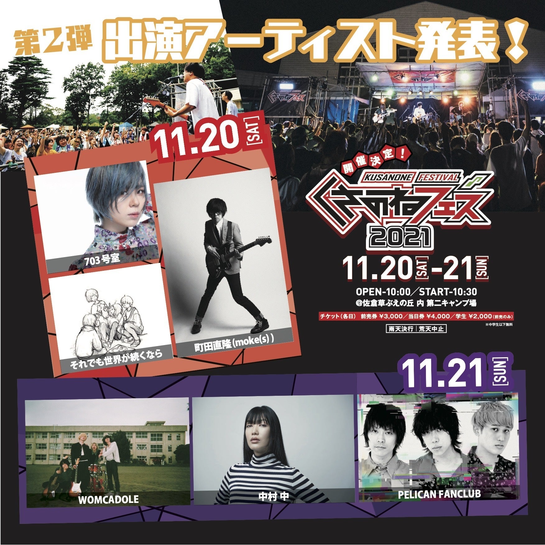 【チケット一般発売開始】 *10/21(木) 12:00〜プレイガイド:イープラス / Livepocket 等詳しくは、公式サイトまで⇨https://sakura-kusanone-2021.com/*高校生学割のチケット販売は、Sound Stream sakura / TSUTAYA佐倉店 / 佐倉市観光協会の店頭販売分のみとなります【出演者情報】-11/20(土)-それでも世界が続くなら , 町田直隆(moke(s) ) , 703号室 , TORAfic☆signALL , S.Dragon-Er , 髙橋優躍&オメガドライブ , カグライフ , 唱頂の大員 , 平間やすおBAND , DEUCE , THE DRAGON★FLY , Fools In the Castle , 河野圭佑 , ジ・オチムシャーズ , クロトミクトガネ , ROKD , 夜桜 , STIR MAY , JIN feat. K.I.D , アトイップンデアシタ , フジサキヒビキ , ぬまのかずし , もりきこ , じん , 上保美香子-11/21(日)-中村 中 , PELICAN FANCLUB , WOMCADOLE , KAKASHI , toybee , ユレニワ , QLTONE , 月がさ , 明くる夜の羊 , ポラロイズ , マッドネスマンボウ , レイラ , わたいとサイキ(Halo at 四畳半) , Organic Call , CULTURES!!! , Hivari , アシタカラホンキ! , 高沢渓太 , はぴぐら , 山先大生 , ミツハシヒロキ , 岩船ひろき , 古木 衆 , 同心円 , Utaco.【お問い合わせ】くさのねフェスティバル実行委員会事務局(ライブハウスSound Stream sakura内)043-463-5963(15:00-21:00)