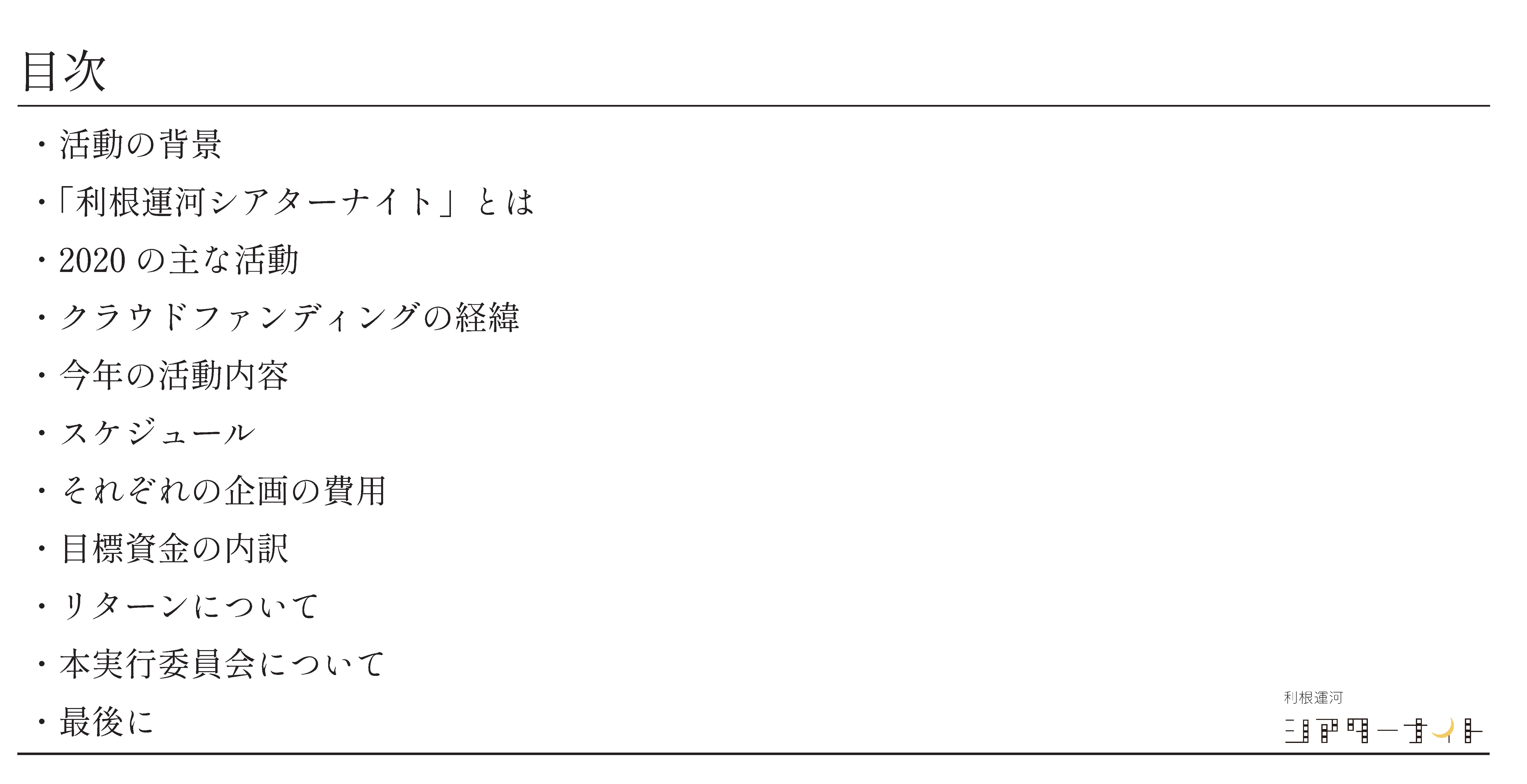 学生が主体となっている本活動は、次の学年が引き継いでいかなければ続きません。しかし、現在の1,2年生は、「利根運河シアターナイト」を知らず、3年生は、ここで途絶えさせてはならないという想いで活動しています。また、利根運河シアターナイト実行委員会は、今年で活動10年目を迎え、活動内容含めて大きな変革期にいると考えています。今後も利根運河を盛り上げる団体として、継続・発展していくためにも皆さんのお力添えをよろしくお願いいたします!