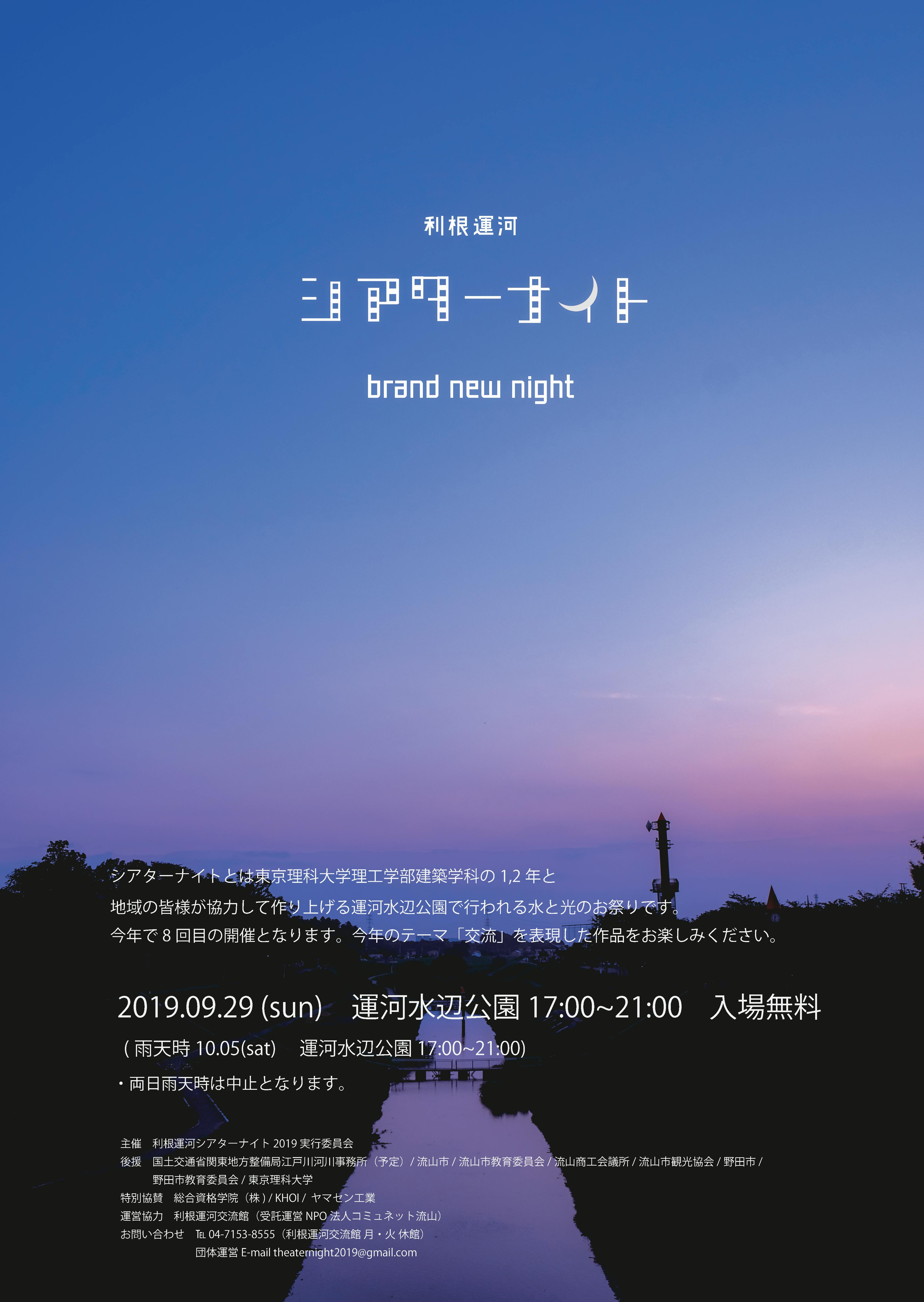 「利根運河シアターナイト」とは、例年秋ごろに利根運河を舞台に開催する光と水の祭典です。「シアター」を映画館ではなく劇場ととらえ、「利根運河を一夜限りの劇場に」というテーマで、学生によるインスタレーション・ワークショップ・パフォーマンス・映像放映他、市民出店者様による飲食物等の販売等を行い、市民・学生・その他多くの方々が日常とは異なった利根運河を共に体験・記憶できるような参加型のイベントとなっています。例年、多くの地域の方々からのご理解とご協力を賜り、新たな交流を生む場として2012年より本イベントは続いて参りましたが、昨年は新型コロナウイルスの感染拡大により中止となり、今回で9回目を数えます。(※下は2019年度のポスターです。)
