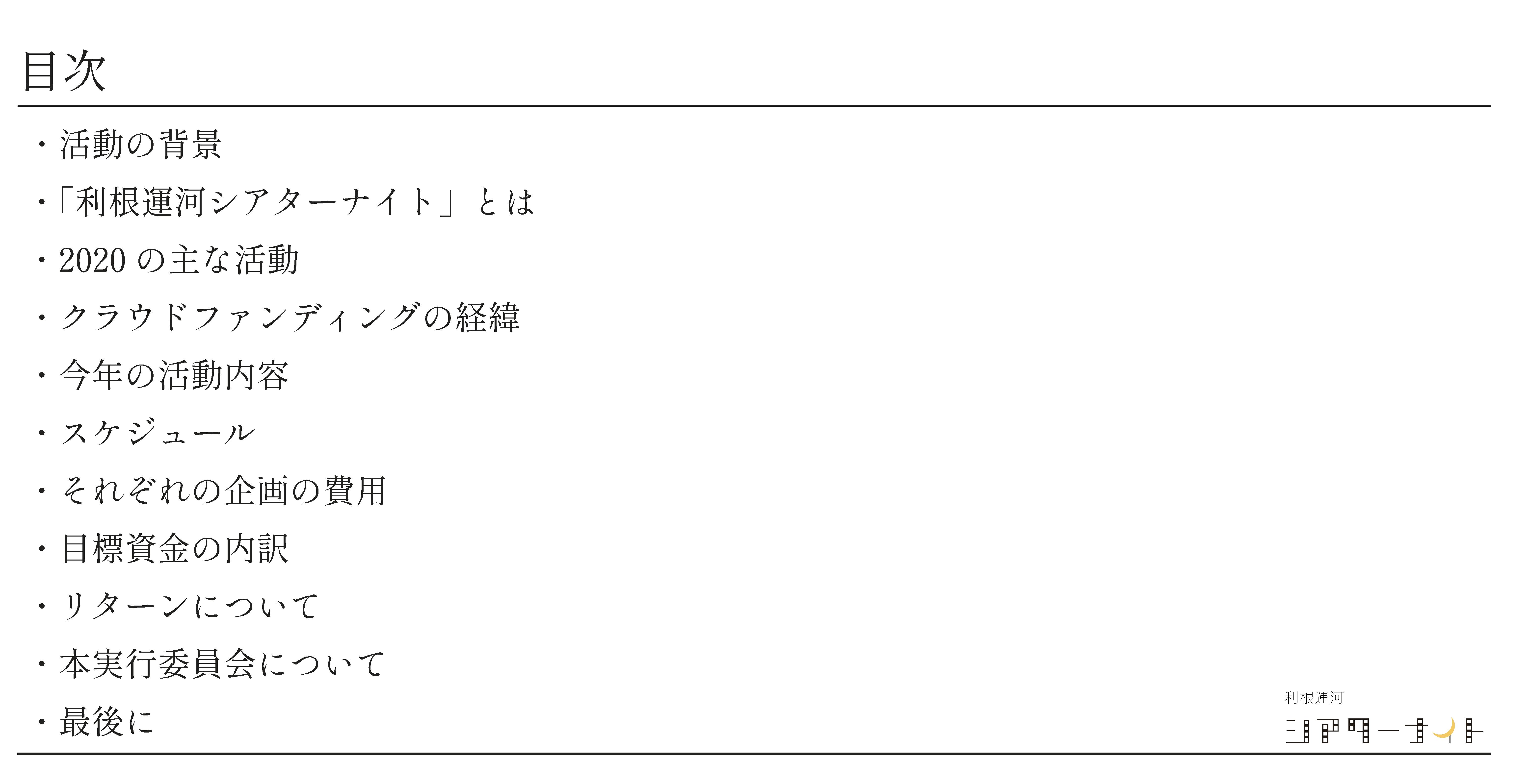 昨年「利根運河シアターナイト」が開催できなかったため、1、2年生はシアターナイトを知りません。3年生は、今年こそはという想いと、ここで途絶えさせてはならないという想いで活動しています。また、今年で本委員会が活動10年目を迎えることもあり、より活動の幅を広げるべく、新しい試みを取り入れたいと考えています。加えて、今年はコロナ対策に係る備品購入等の費用やそれに伴う会場の拡大等もあり、例年よりも多くの資金を必要としています。これまでも周辺の企業や商店など、地域の方々やその他たくさんの方にご支援いただいて活動しておりますが、今後の継続・発展のためにもより多くのことに挑戦すべく、皆様のご支援が必要です。よろしくお願いいたします!