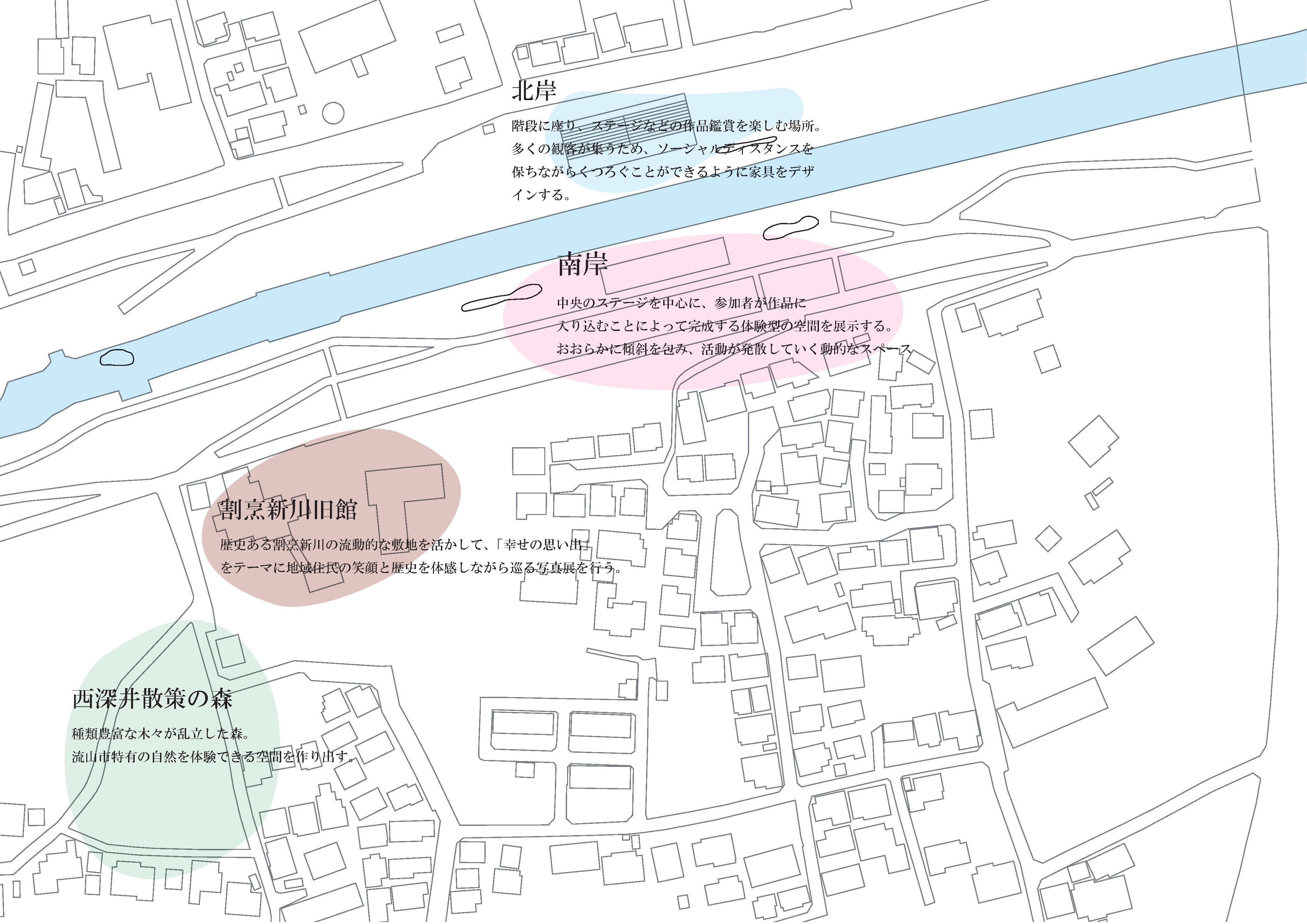 例年使用している、運河水辺公園の北岸・南岸に加えて、割烹新川本館の敷地と西深井散策の森を会場とする予定です。利根運河を一世紀以上見守ってきた割烹新川さんの敷地と水辺とは違う環境を持つ森を会場に加えることで、それぞれ雰囲気の異なる空間演出を行います。また、これはコロナ対策として、会場の密を避けるための試みでもあります。
